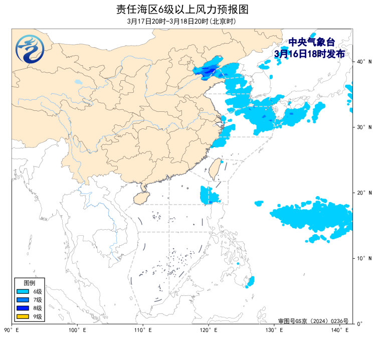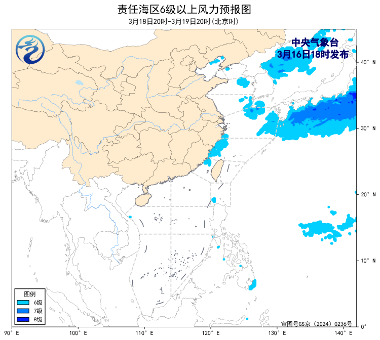 預計,3月19日夜間至23日白天,渤海、渤海海峽、東海大部海域、台灣海峽、巴士海峽、北部灣、南海東北部海域、南海中西部海域、南海中東部海域、南海東南部海域將有5~6級、陣風7級的風。