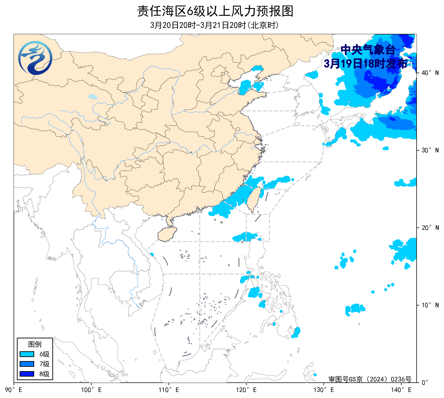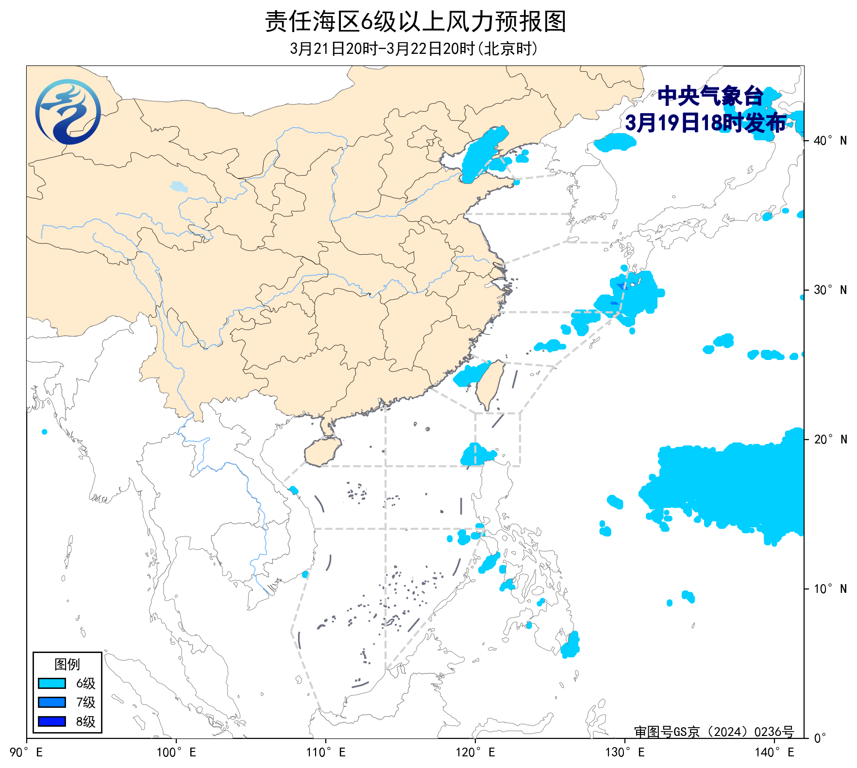預計,3月22日夜間至26日白天,渤海、東海大部海域將有6~7級、陣風8級的風,渤海海峽、黃海北部海域、巴士海峽、南海東北部海域、南海中西部海域、南海東南部海域將有5~6級、陣風7級的風。