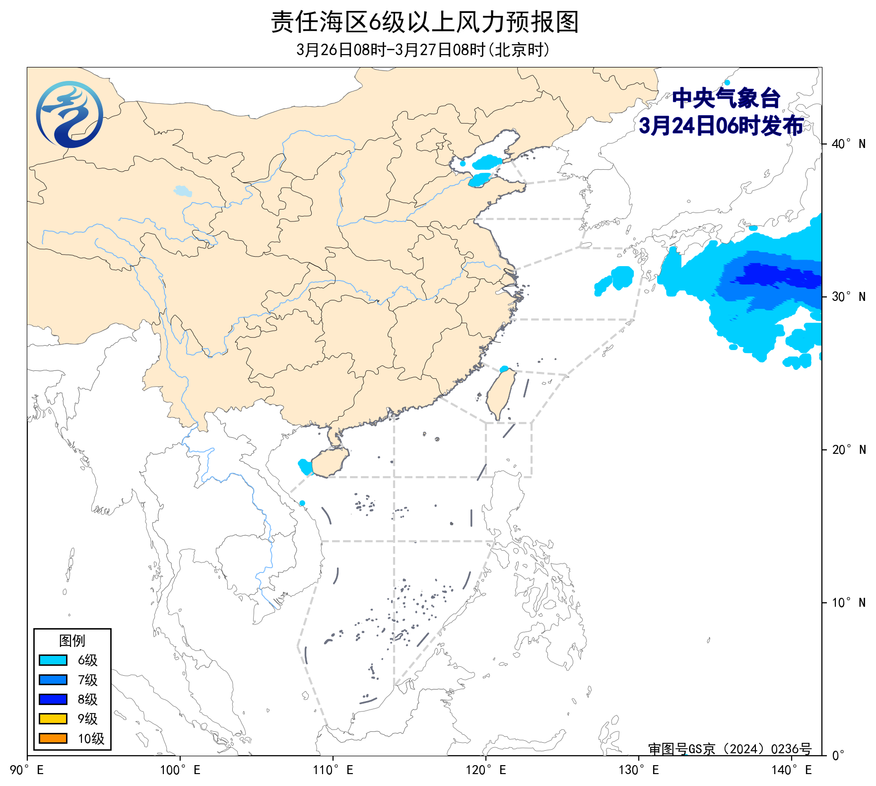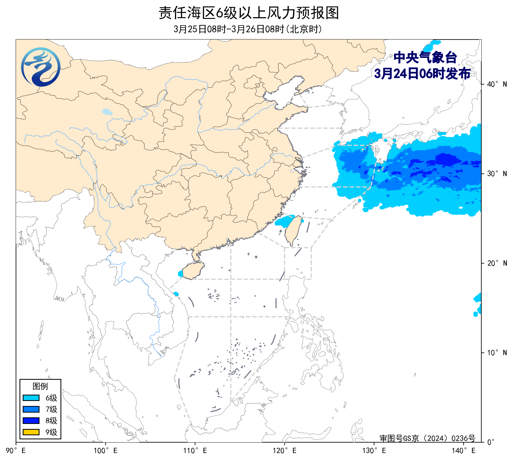 24日08時至25日08時,東海北部海域將有5~6級、陣風7級的東北風。