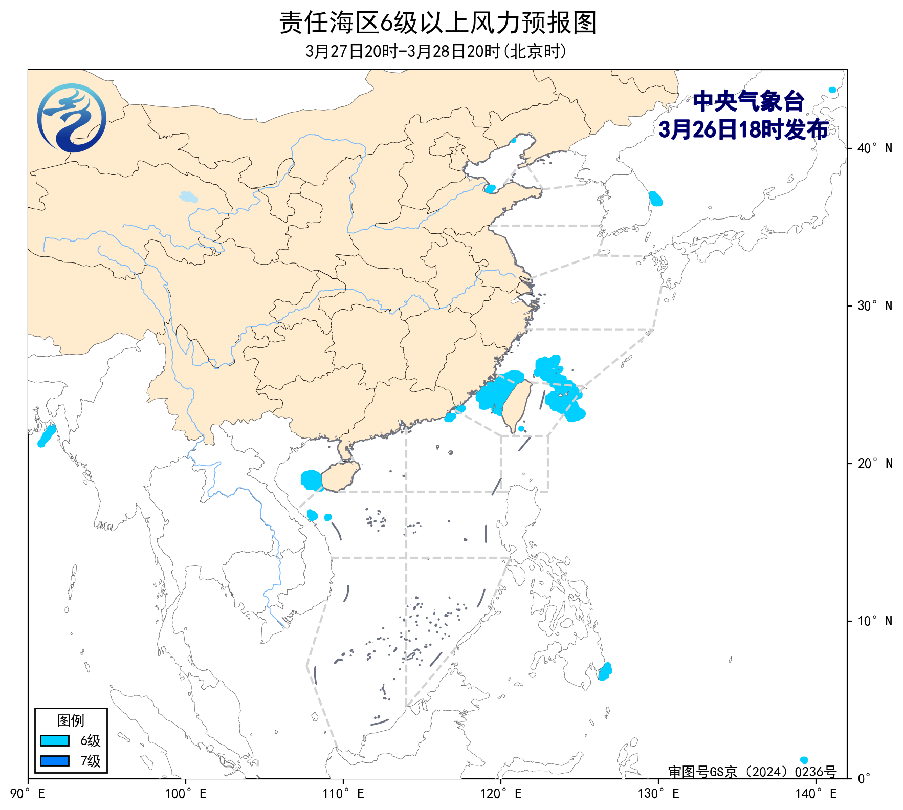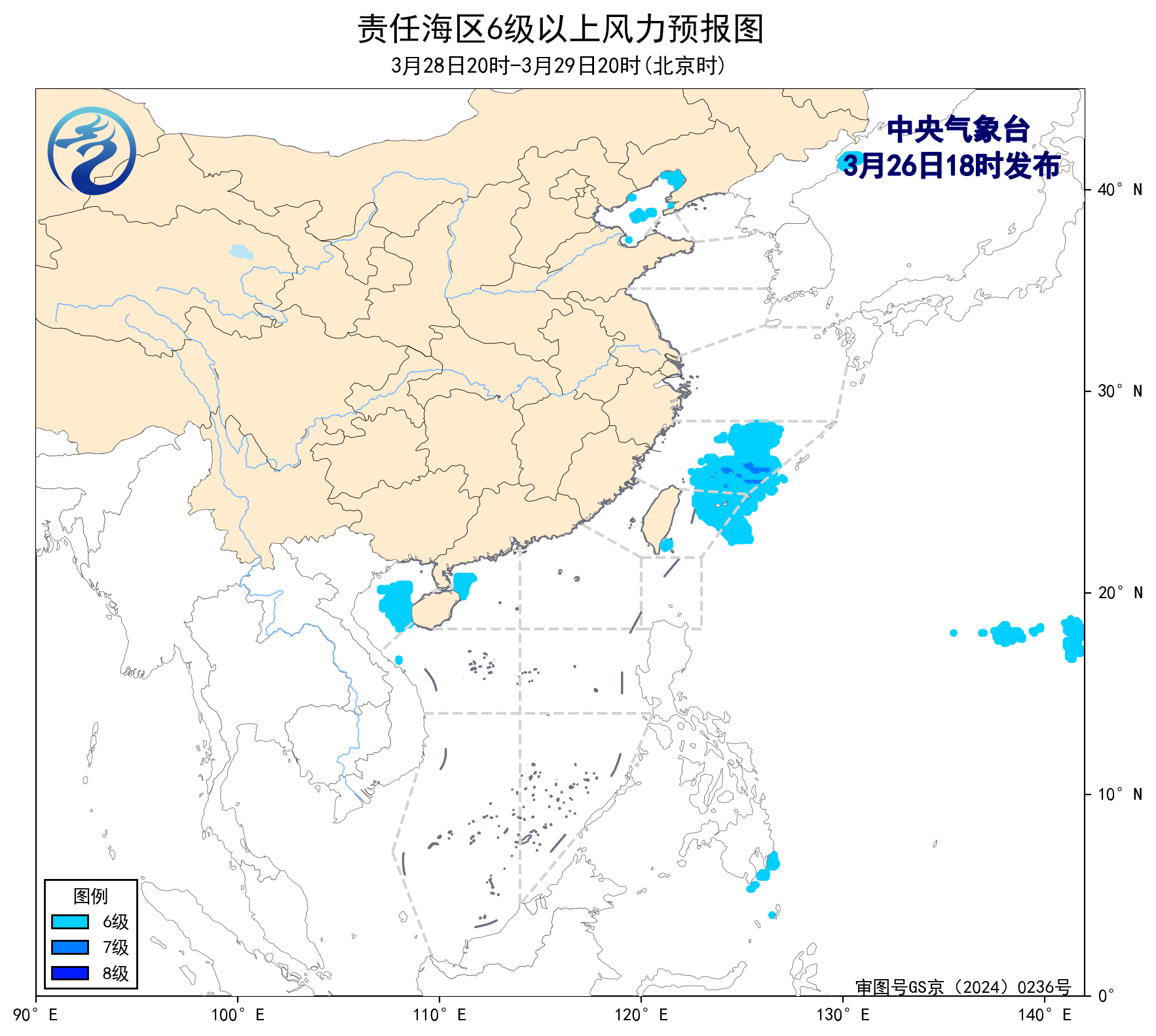 預計,3月29日夜間至4月2日白天,渤海、黃海大部海域將有6~8級、陣風9級的大風,渤海海峽、台灣海峽、台灣以東洋面、南海西北部海域、南海東北部海域、南海中西部海域、南海西南部海域將有6~7級、陣風8級的風,東海大部海域將有8~9級、陣風10級減弱至6~7級、陣風8級的風,巴士海峽、北部灣將有5~6級、陣風7級的風。
