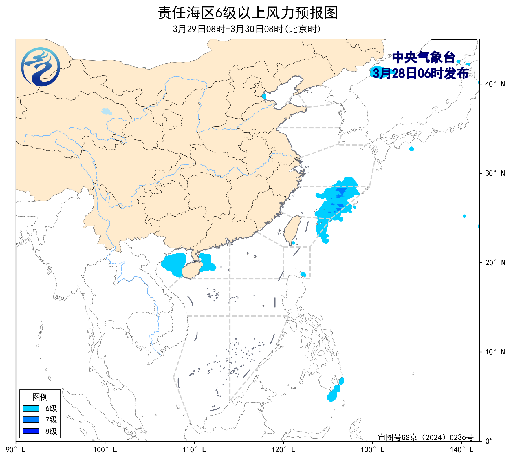 29日08時至30日08時,東海南部海域、北部灣將有5~6級、陣風7級的偏南風。