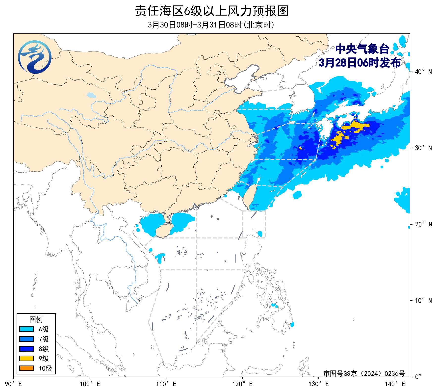 30日08時至31日08時,東海北部海域將有7~8級、陣風9~10級的西南風,黃海南部海域將有6~7級、陣風8級的偏北風,東海南部海域將有6~7級、陣風8級的偏南到西南風,台灣海峽、台灣以東洋面、北部灣、南海西北部海域將有5~6級、陣風7級的偏南到西南風。