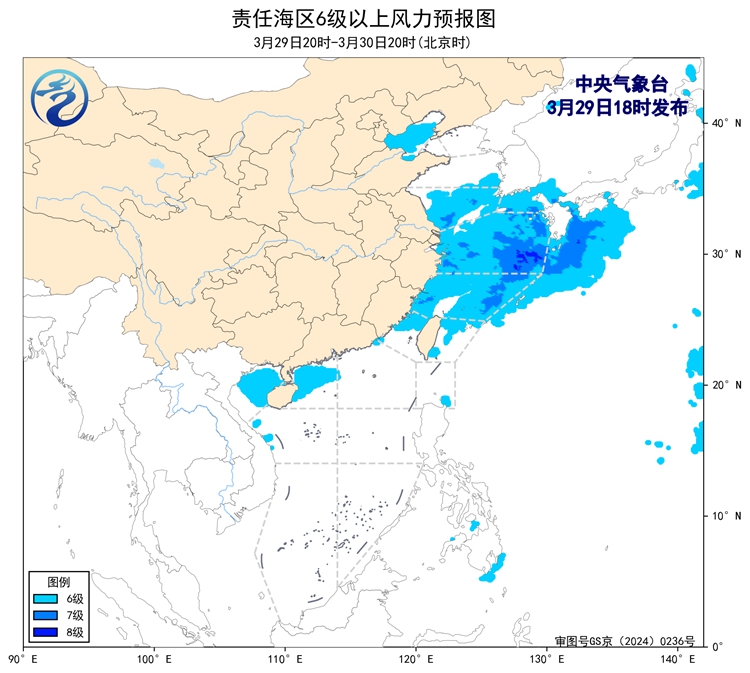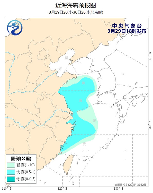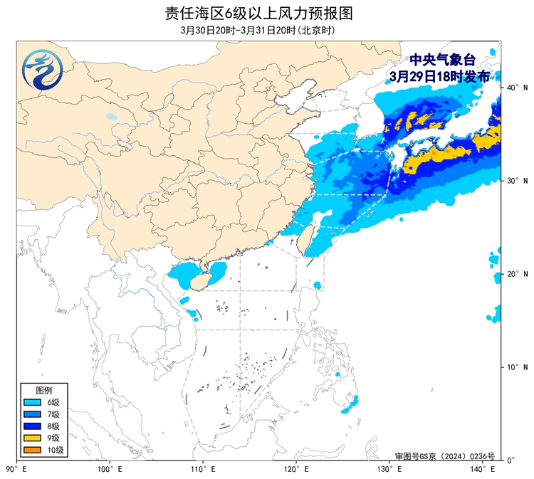 29日20時至30日20時,黃海中部和南部海域、東海西部海域、浙江沿海、福建北部沿海、長江口及杭州灣附近海域將有能見度不足1公里的大霧;東海北部海域將有6~7級、陣風8級的偏南風,東海南部海域將有5~6級、陣風7級的東南風轉西南風,台灣海峽、台灣以東洋面、北部灣、南海西北部海域將有5~6級、陣風7級的偏南到西南風,渤海、黃海南部海域將有5~6級、陣風7級的偏北到東北風。30日白天,浙江南部沿岸海域將有8~10級的雷暴大風。