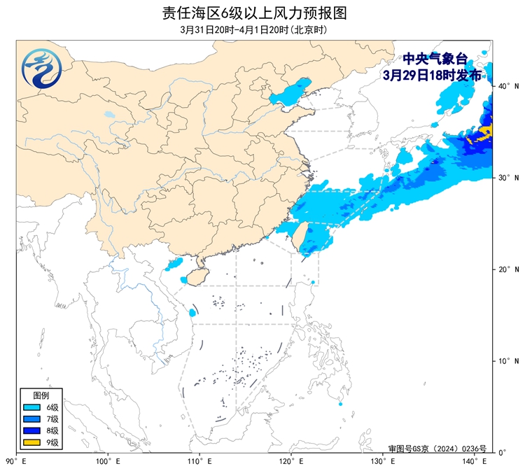 3月31日20時至4月1日20時,台灣以東洋面將有5~6級、陣風7級的西南風轉東北風,渤海、東海南部海域、台灣海峽將有5~6級、陣風7級的偏北到東北風。