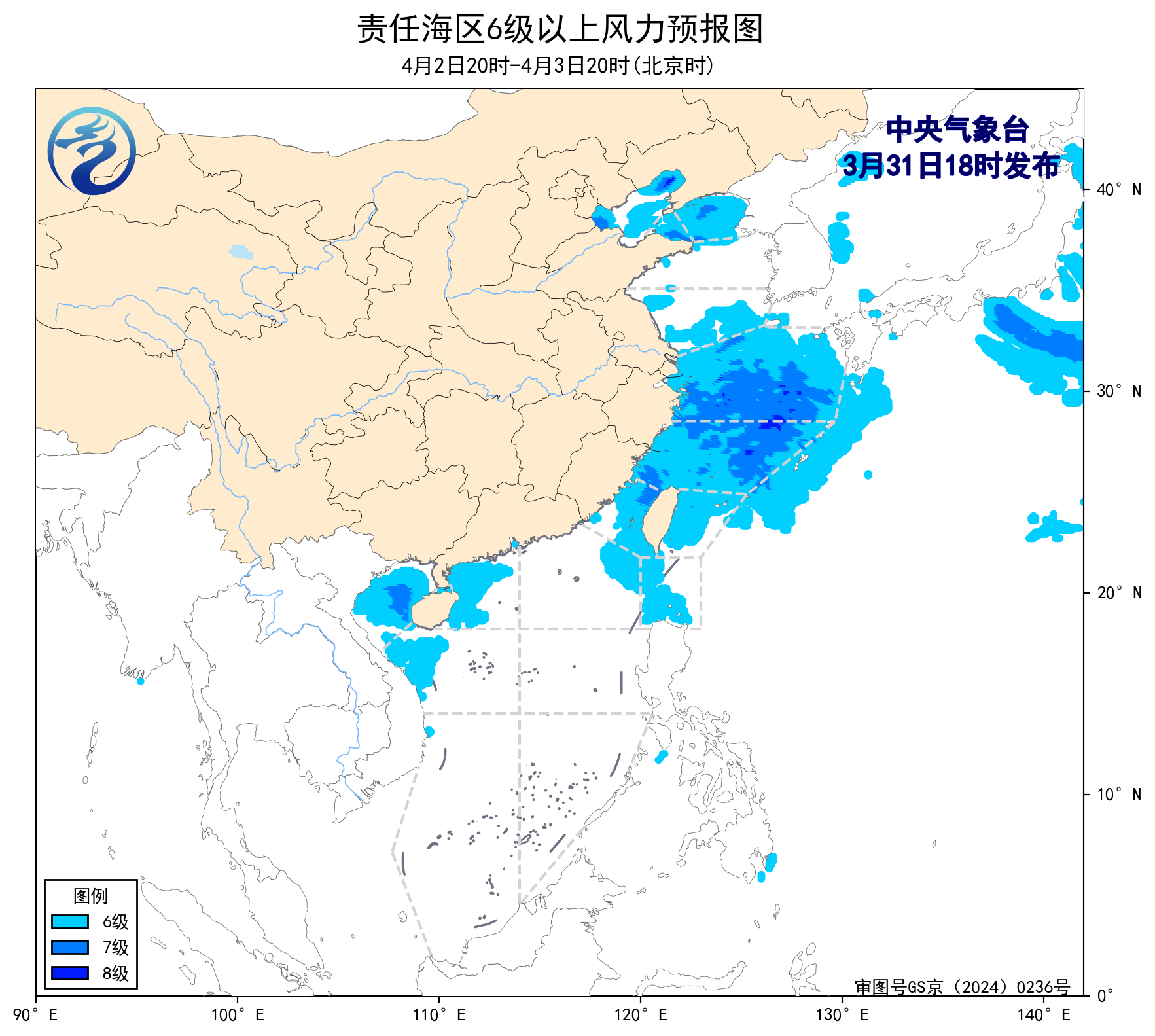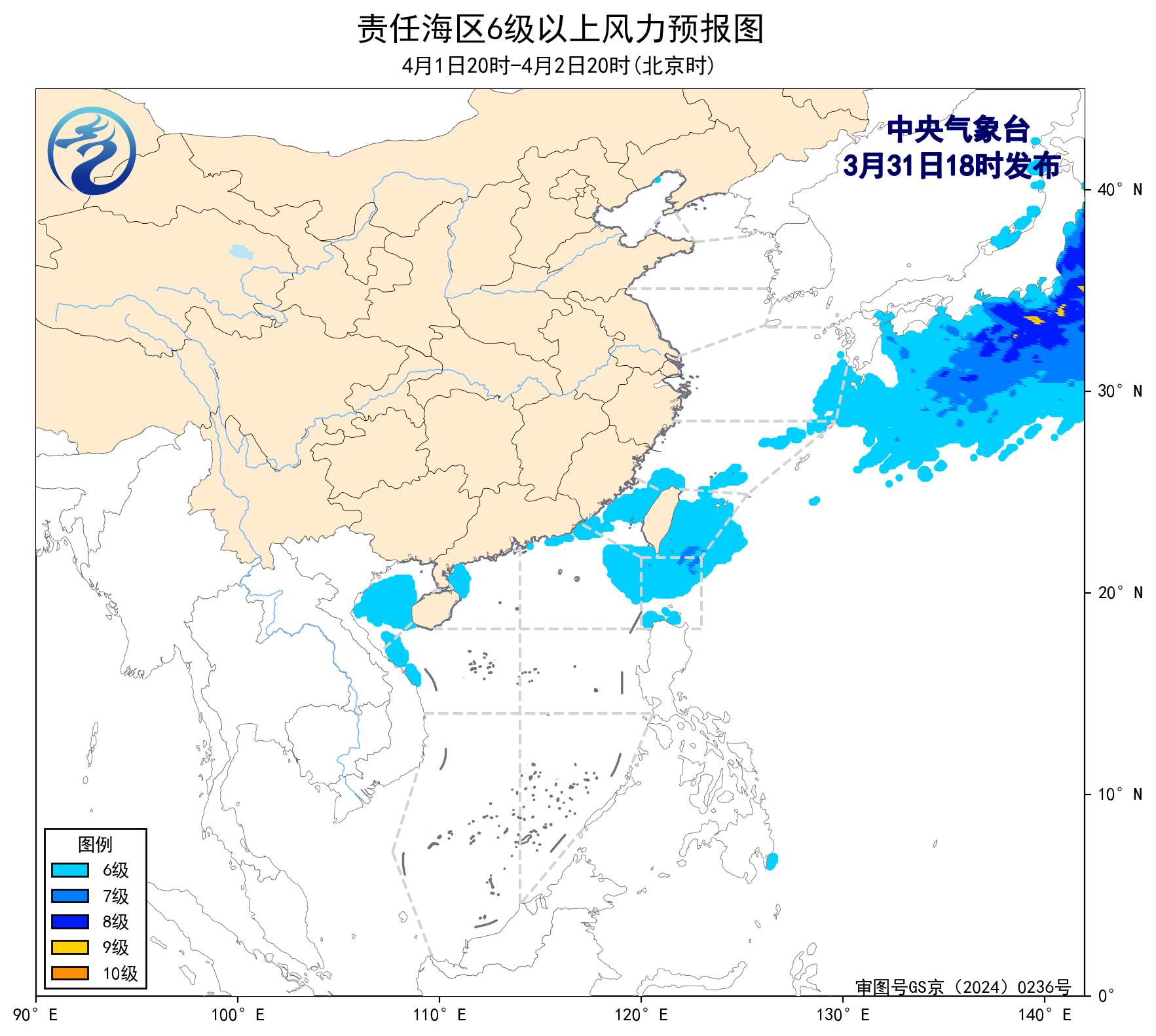 預計,4月3日夜間至7日白天,渤海、台灣以東洋面將有7~8級、陣風9級的大風,渤海海峽、黃海大部海域、北部灣、南海大部海域將有6~7級、陣風8級的風,東海大部海域將有8~9級、陣風10級減弱至6~7級、陣風8級的風,台灣海峽將有6~8級、陣風9級的大風,巴士海峽將有5~6級、陣風7級的風。