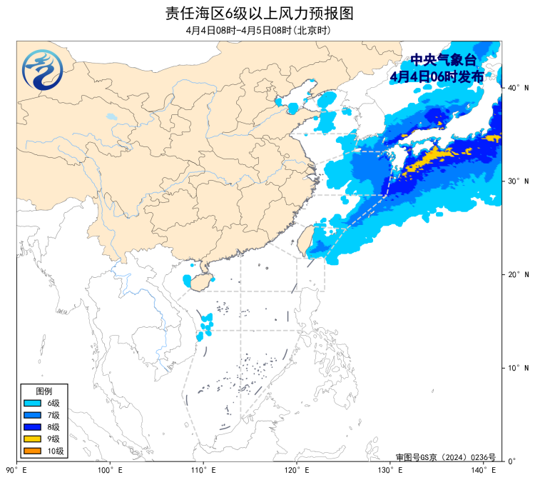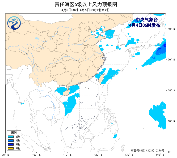 4日08時至5日08時,東海東部海域、台灣以東洋面將有7~8級、陣風9級的風,黃海中部和南部海域將有5~6級、陣風7級的偏北風,黃海北部海域將有5~6級、陣風7級的偏南到西南風。