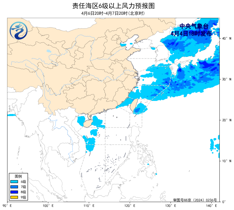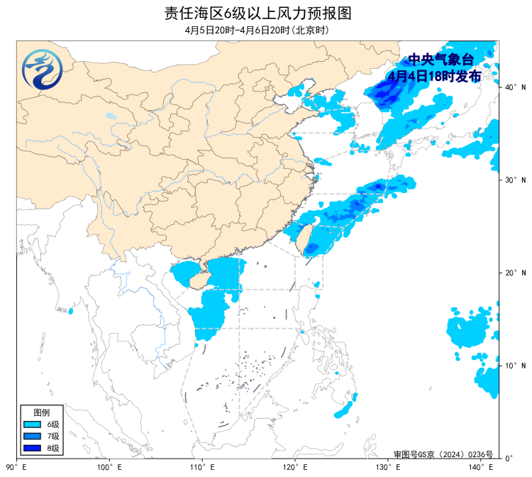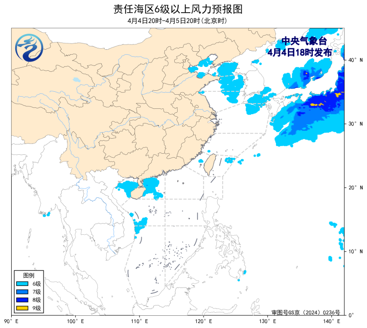 4日20時至5日20時,黃海北部和中部海域、北部灣、南海西北部海域將有5~6級、陣風7級的偏南風。