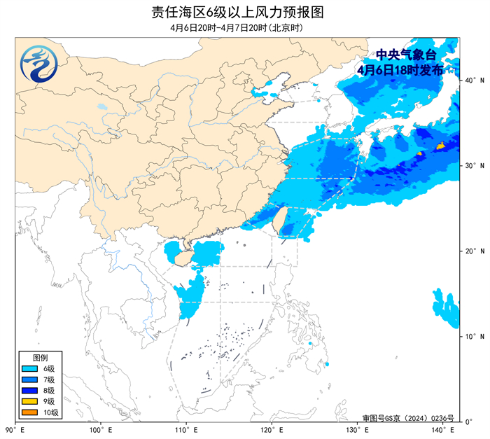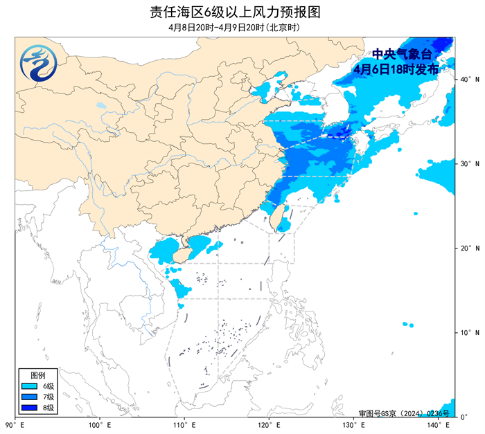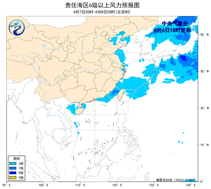 預計,4月9日夜間至10日夜間,渤海、黃海大部海域、台灣海峽、台灣以東洋面將有6~7級、陣風8級的風,東海大部海域將有6~8級、陣風9級的大風。11日白天至13日白天,渤海、北部灣、南海西部海域將有5~6級、陣風7級的風。