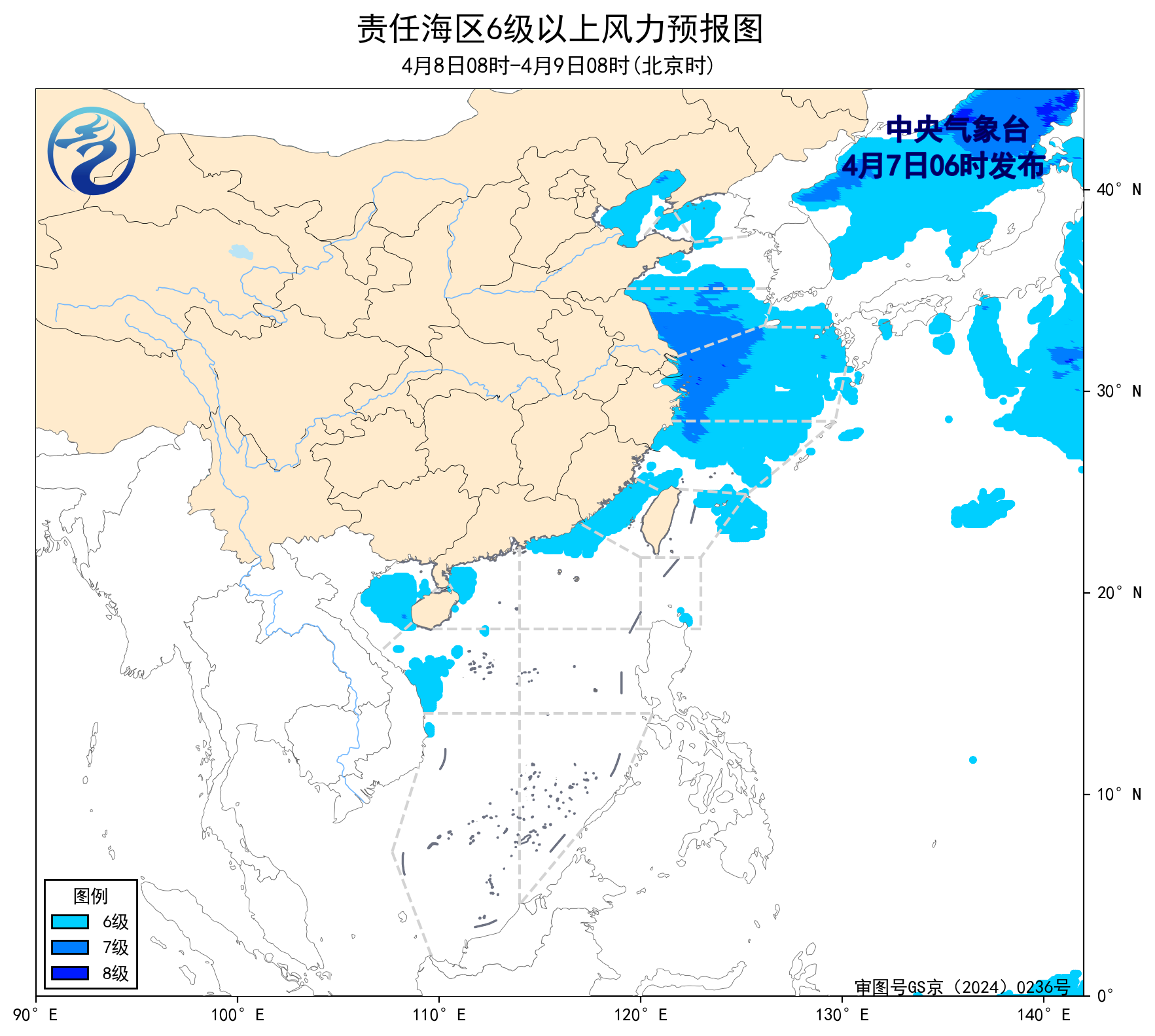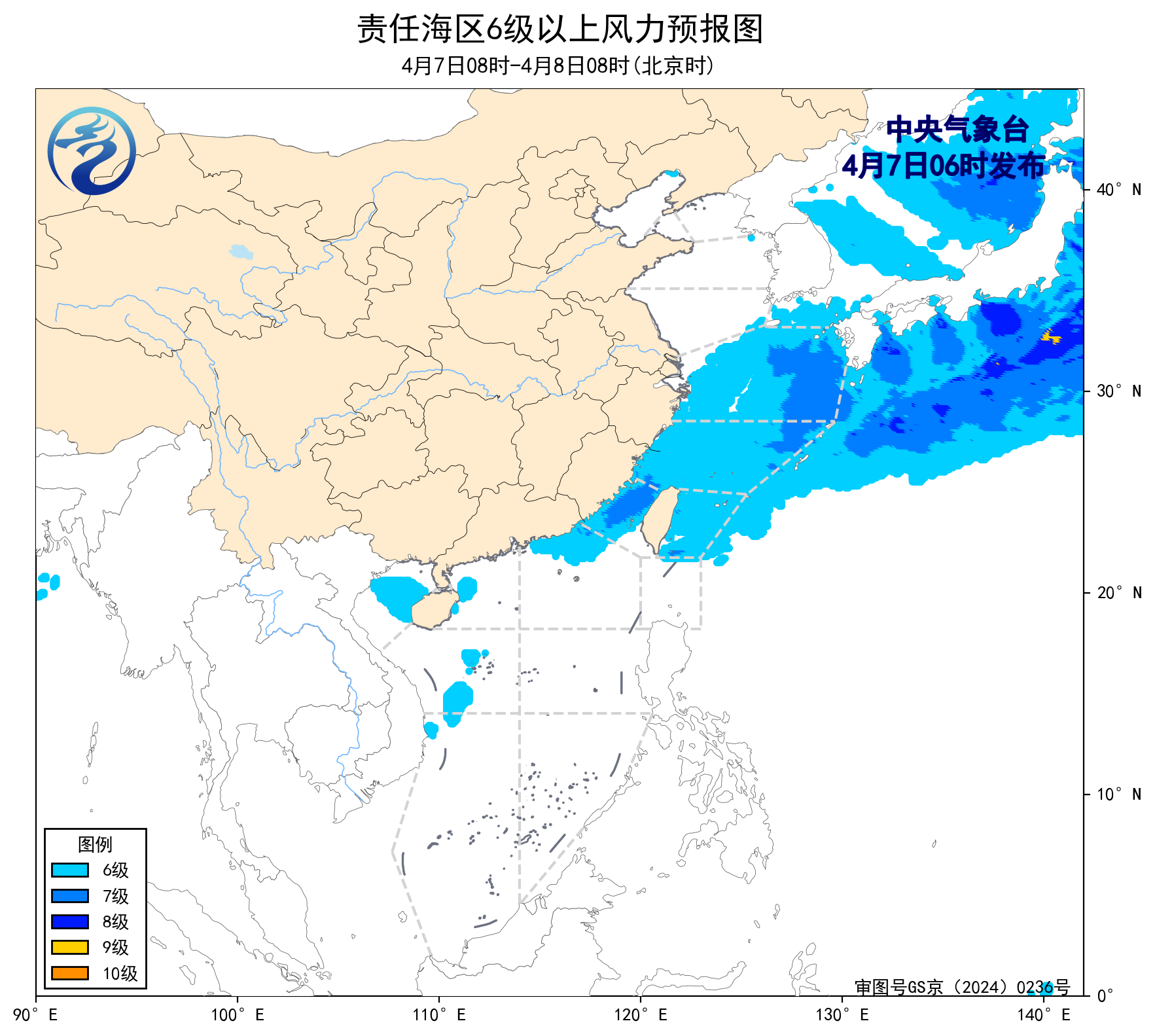4月6日14時至7日02時,黃海南部海域、東海西部海域出現了5~7級、陣風8級的偏北風或東北風,東海南部海域、台灣海峽、台灣以東洋面、南海西北部海域、北部灣、南海西南部海域出現了5~7級、陣風8級的偏南風或西南風。