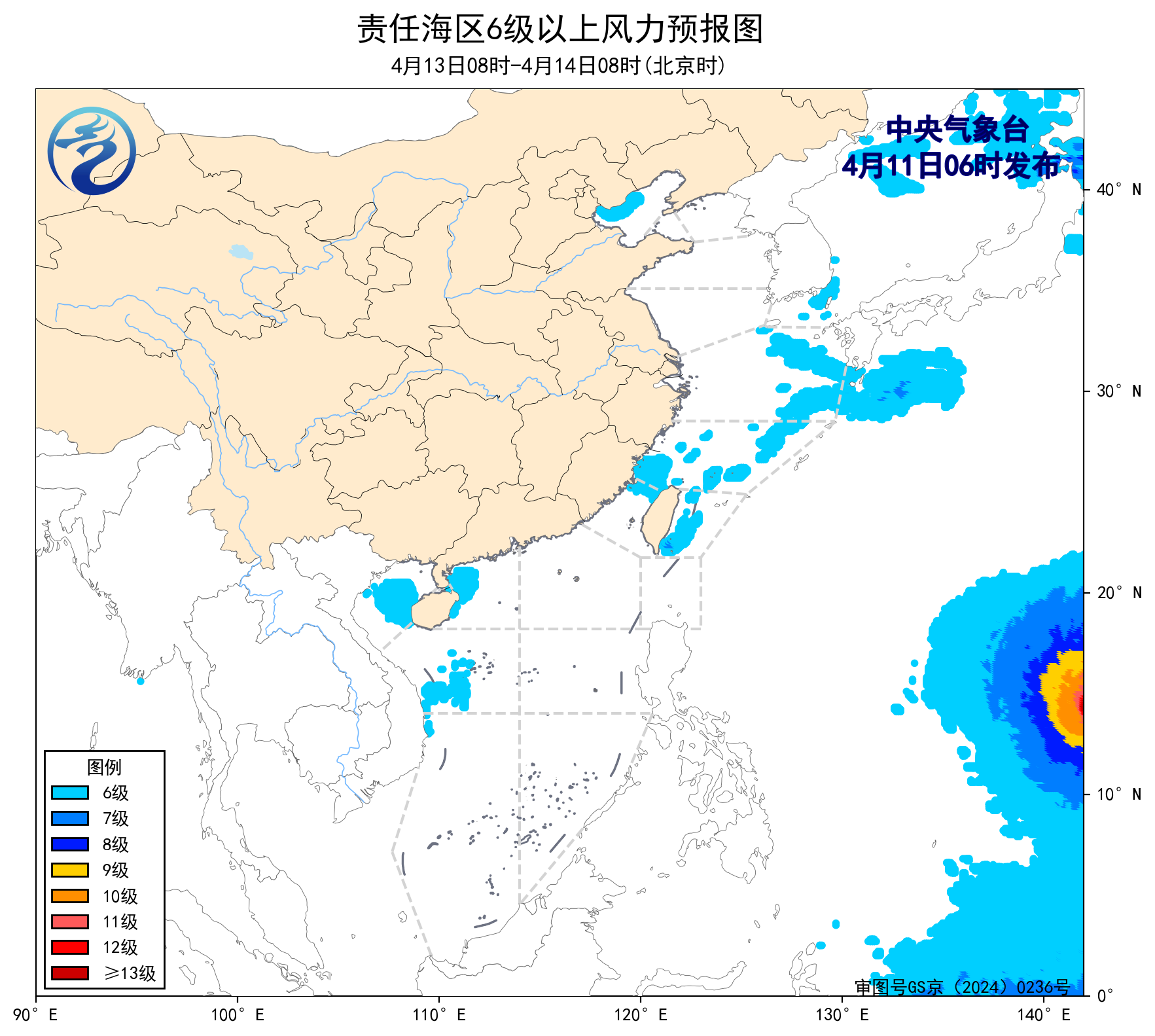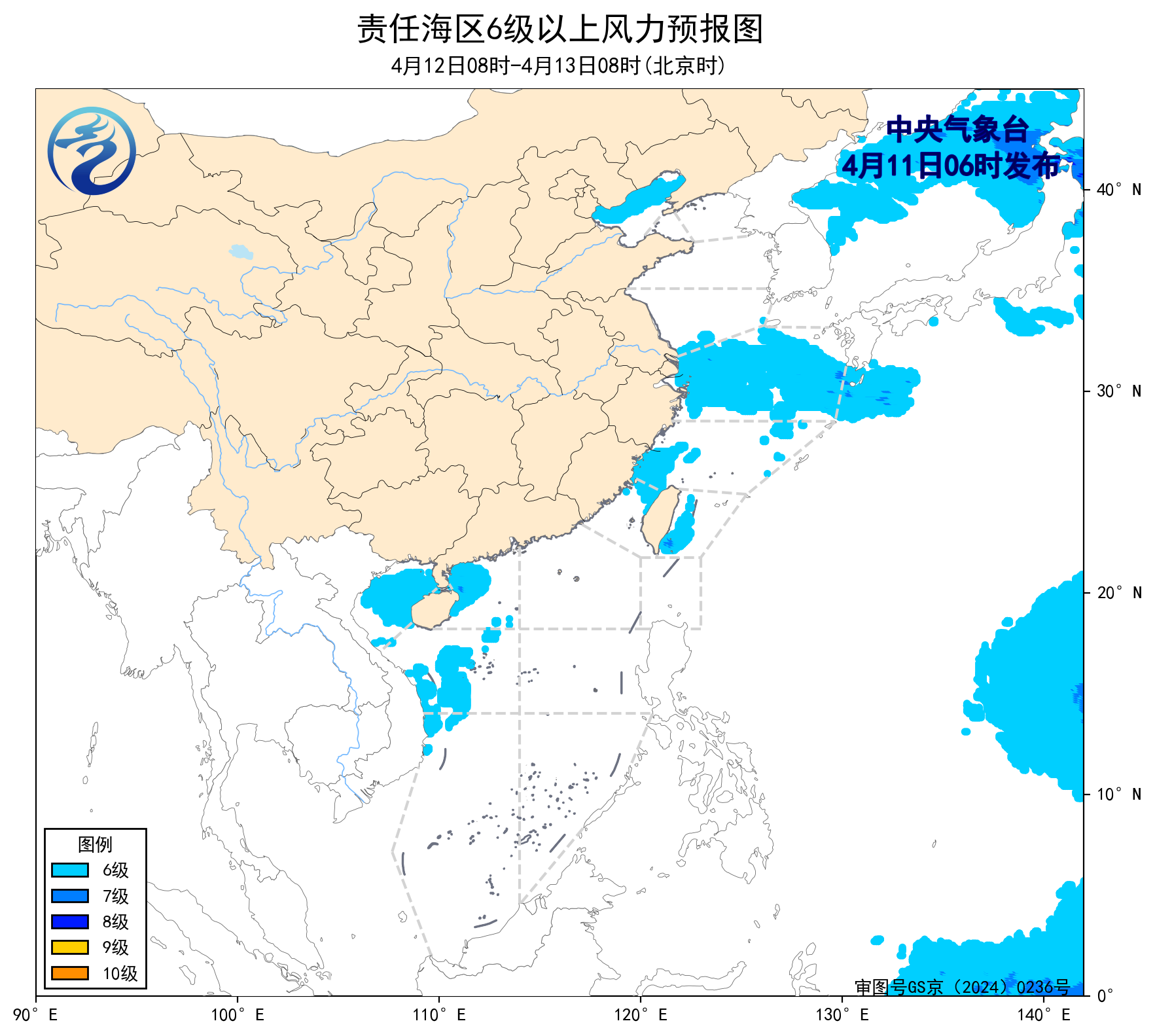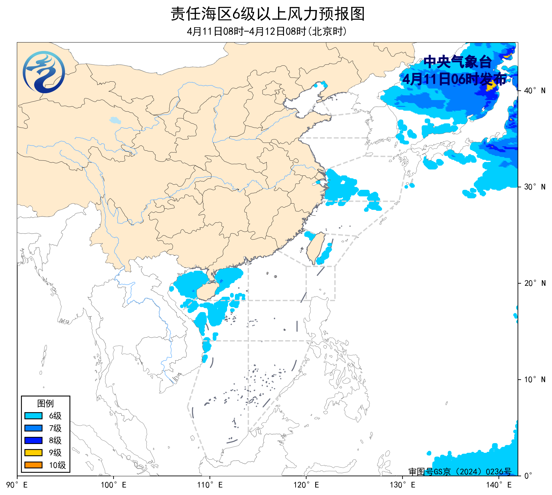11日08時至12日08時,東海北部海域將有5~6級、陣風7級的偏東風,北部灣、南海西北部和中西部海域將有5~6級、陣風7級的偏南風。