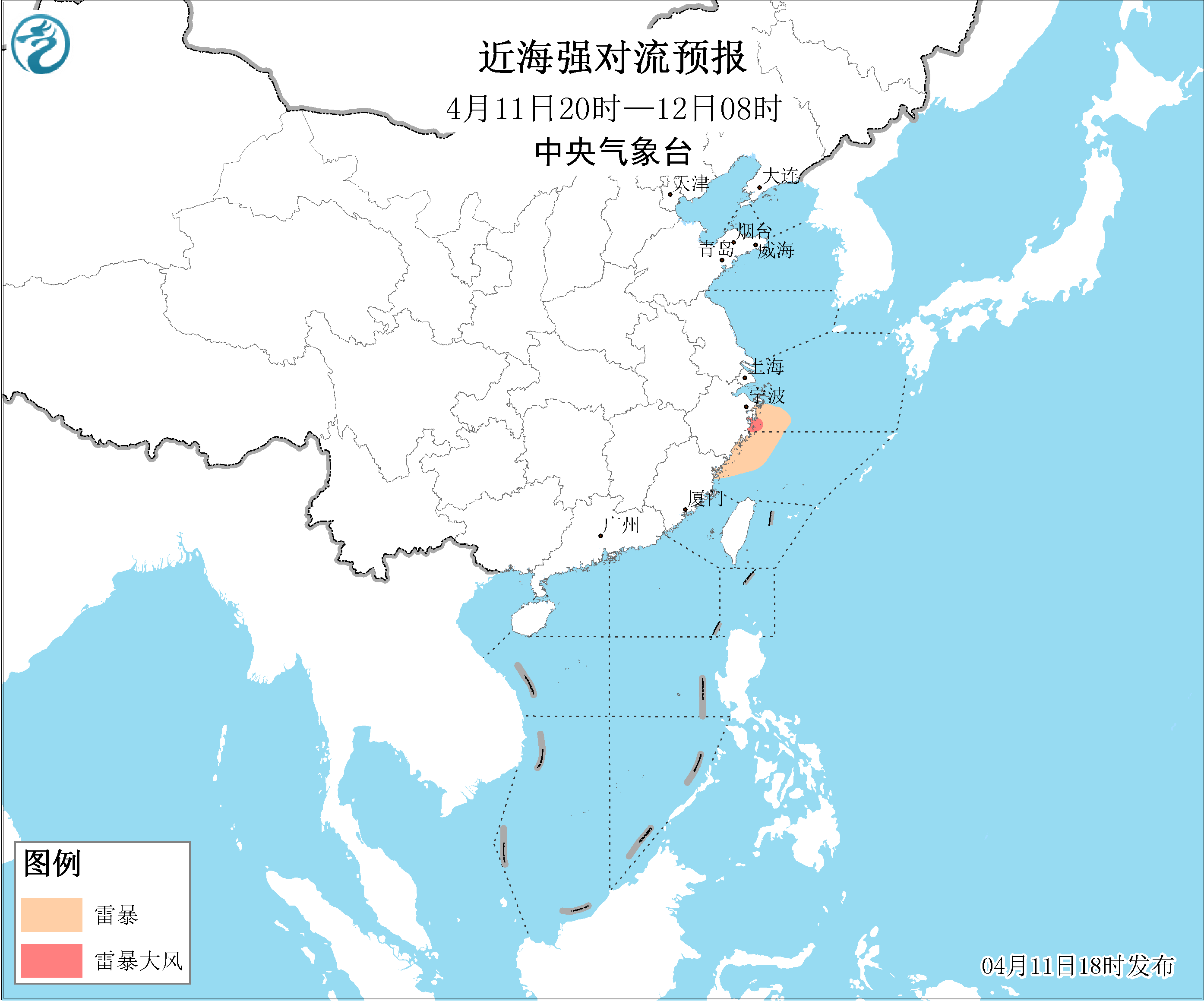 11日20時至12日20時,黃海中西部和南部海域將有能見度不足1公里的大霧,黃海北部海域將有能見度不足10公里的輕霧。東海北部海域將有5~6級、陣風7級的偏東風,北部灣、南海西北部海域將有5~6級、陣風7級的偏南風。此外,11日夜間,浙江中東部沿岸海域將有8~10級雷暴大風。