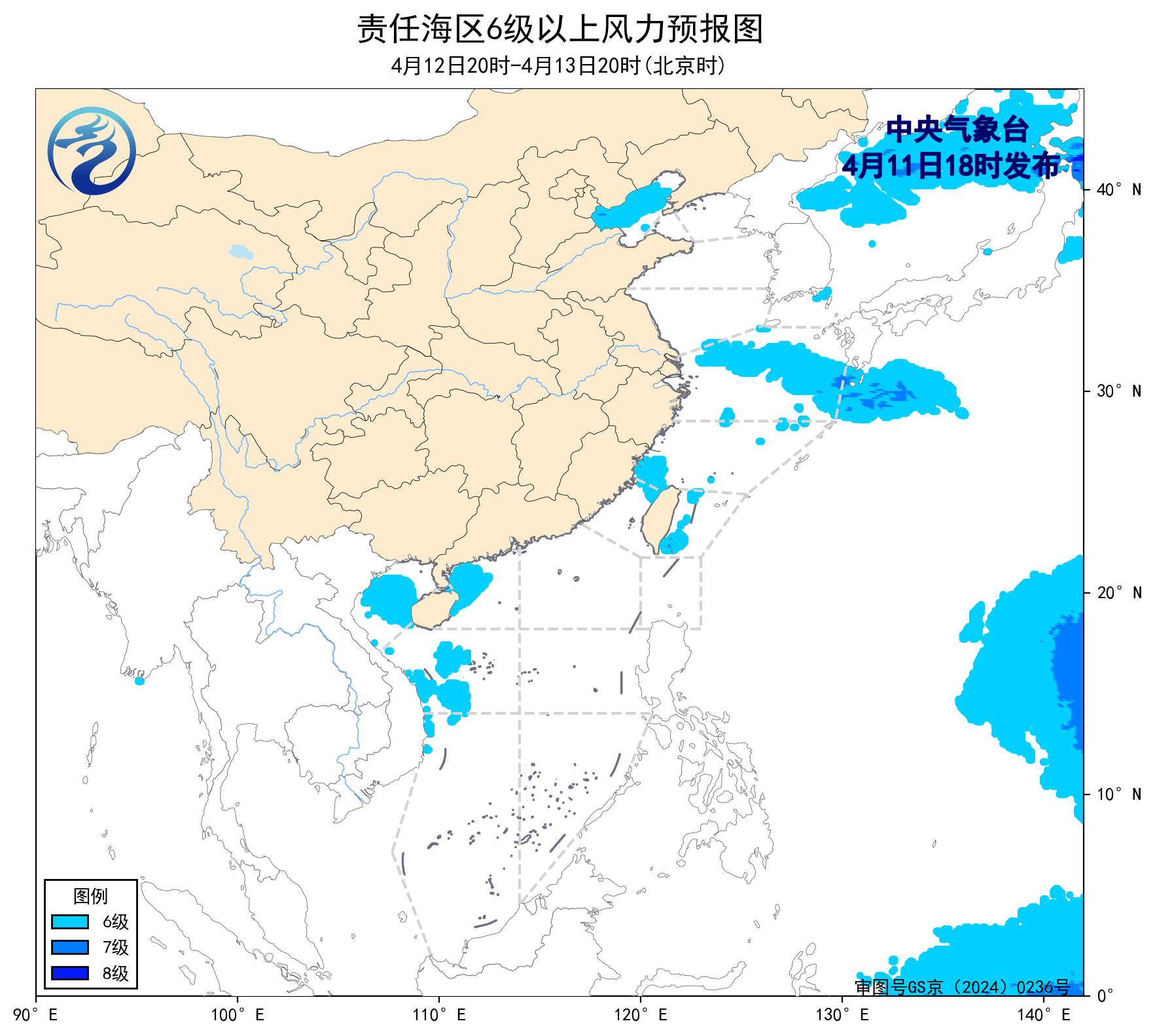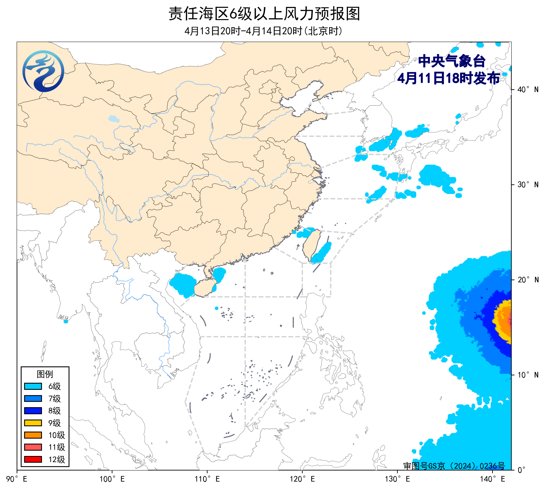 預計,4月14日夜間至18日白天,渤海、渤海海峽、台灣海峽、台灣以東洋面、巴士海峽、北部灣、瓊州海峽、南海西北部和中西部海域將有5~6級、陣風7級的風,黃海北部和南部海域、東海大部海域將有6~7級、陣風8級的風。