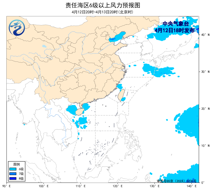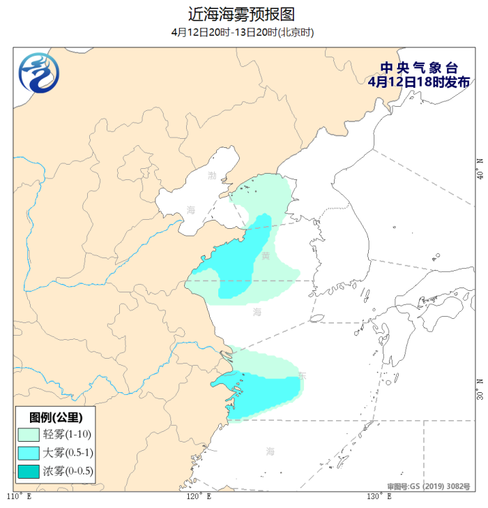 4月12日02時至14時,東海北部海域出現了5~6級、陣風7級的偏東風,台灣以東洋面、南海西北部海域、北部灣出現了5~6級、陣風7級的偏南風。黃海中部和南部海域出現了能見度不足1公里的大霧。