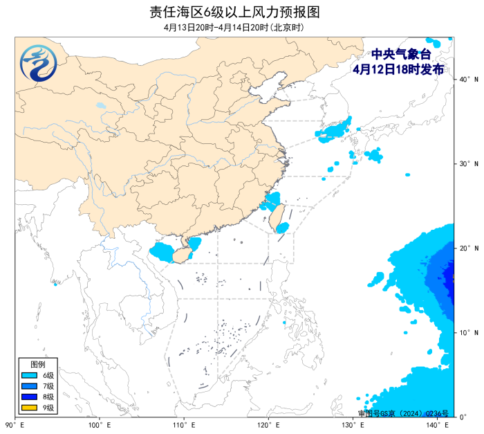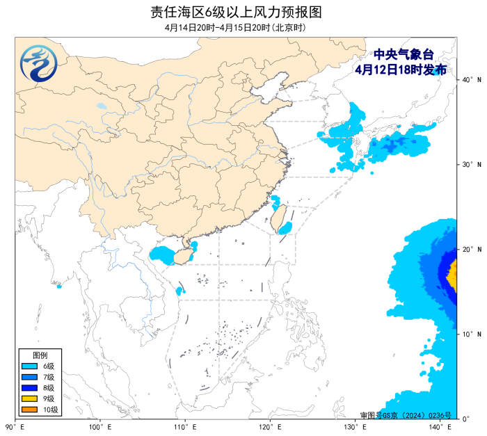預計,4月15日夜間至19日白天,渤海、台灣海峽、台灣以東洋面、北部灣、南海西北部和中西部海域將有5~6級、陣風7級的風,黃海南部海域、東海大部海域將有5~7級、陣風8級的風。