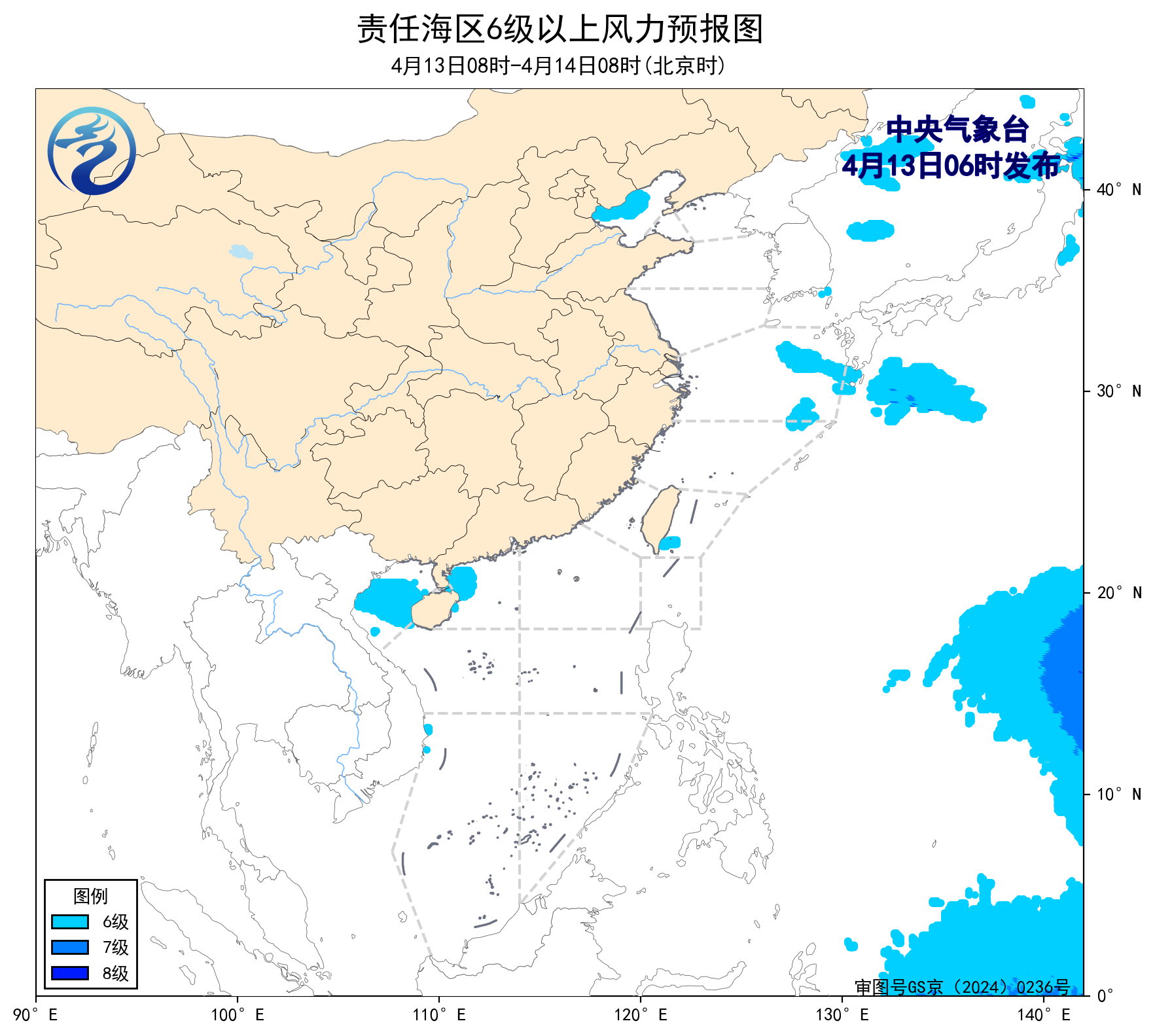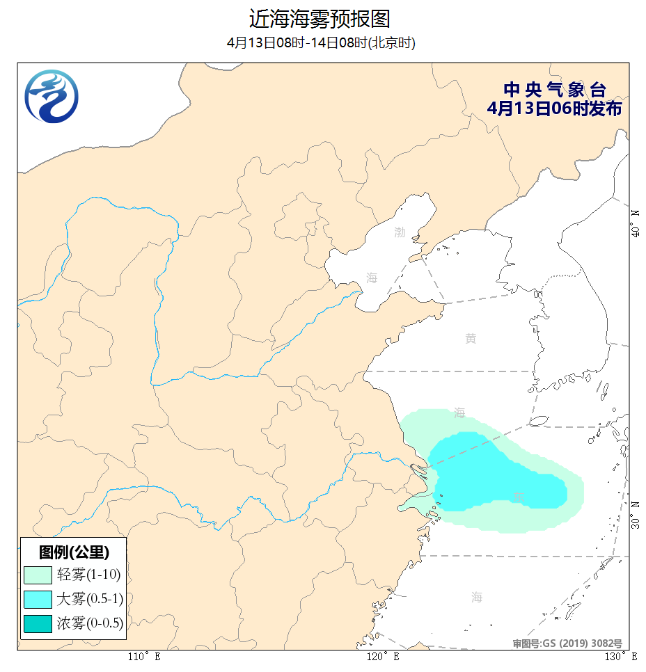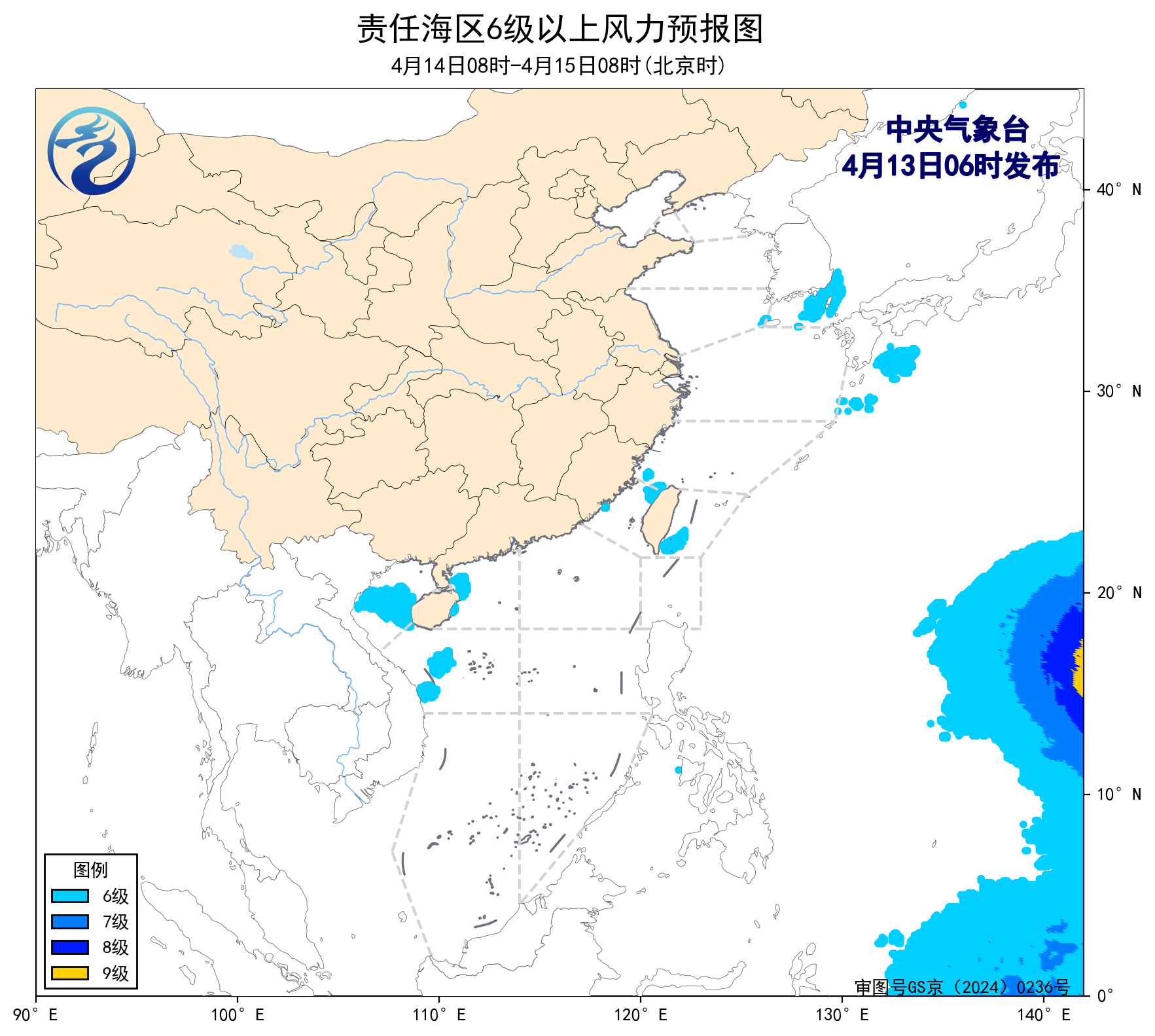 4月12日14時至13日02時,東海北部海域出現了5~6級、陣風7級的旋轉風,台灣以東洋面、南海西北部海域、北部灣出現了5~6級、陣風7級的偏南風。東海北部海域出現了能見度不足1公里的大霧。