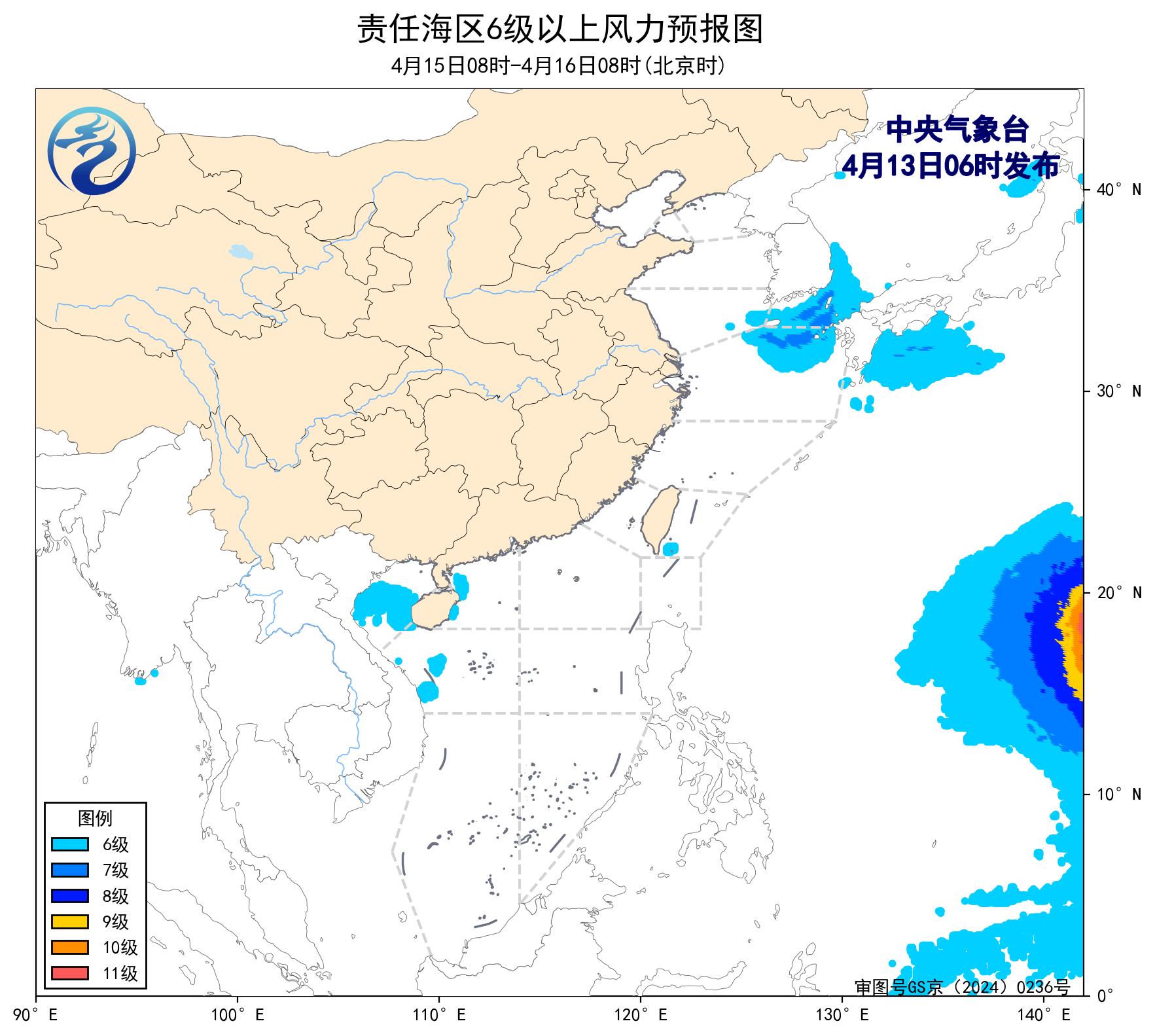 15日08時至16日08時,東海東北部海域將有5~7級、陣風8級的東北風,北部灣將有5~6級、陣風7級的東南風。