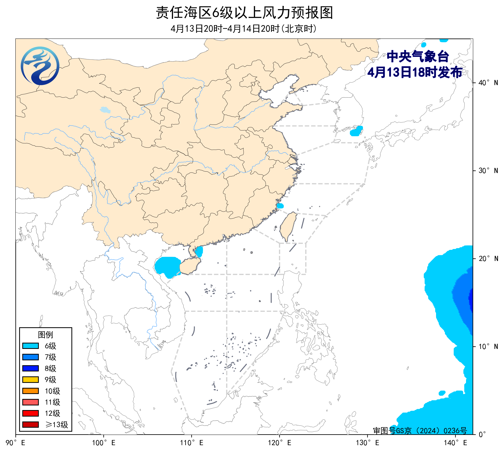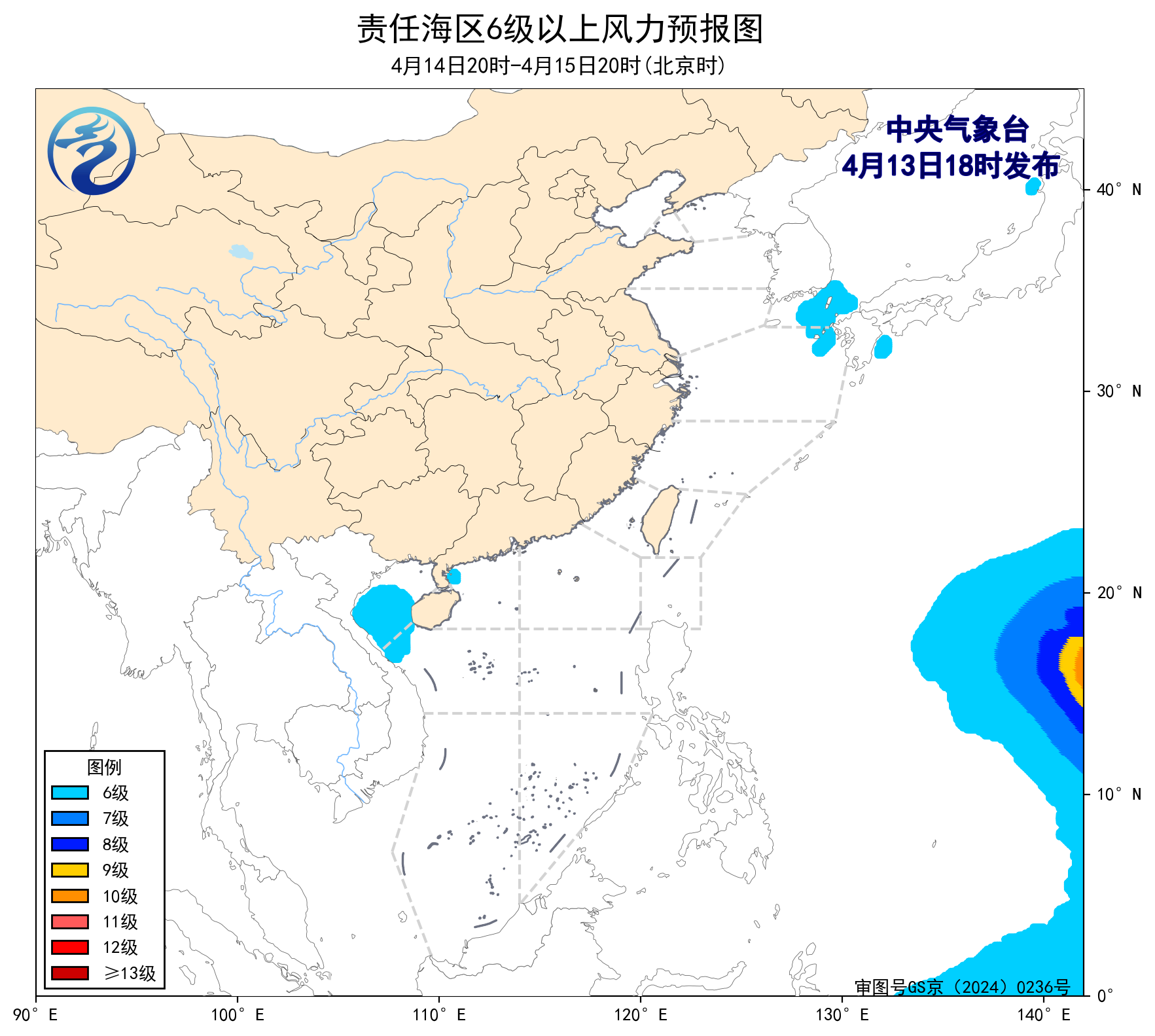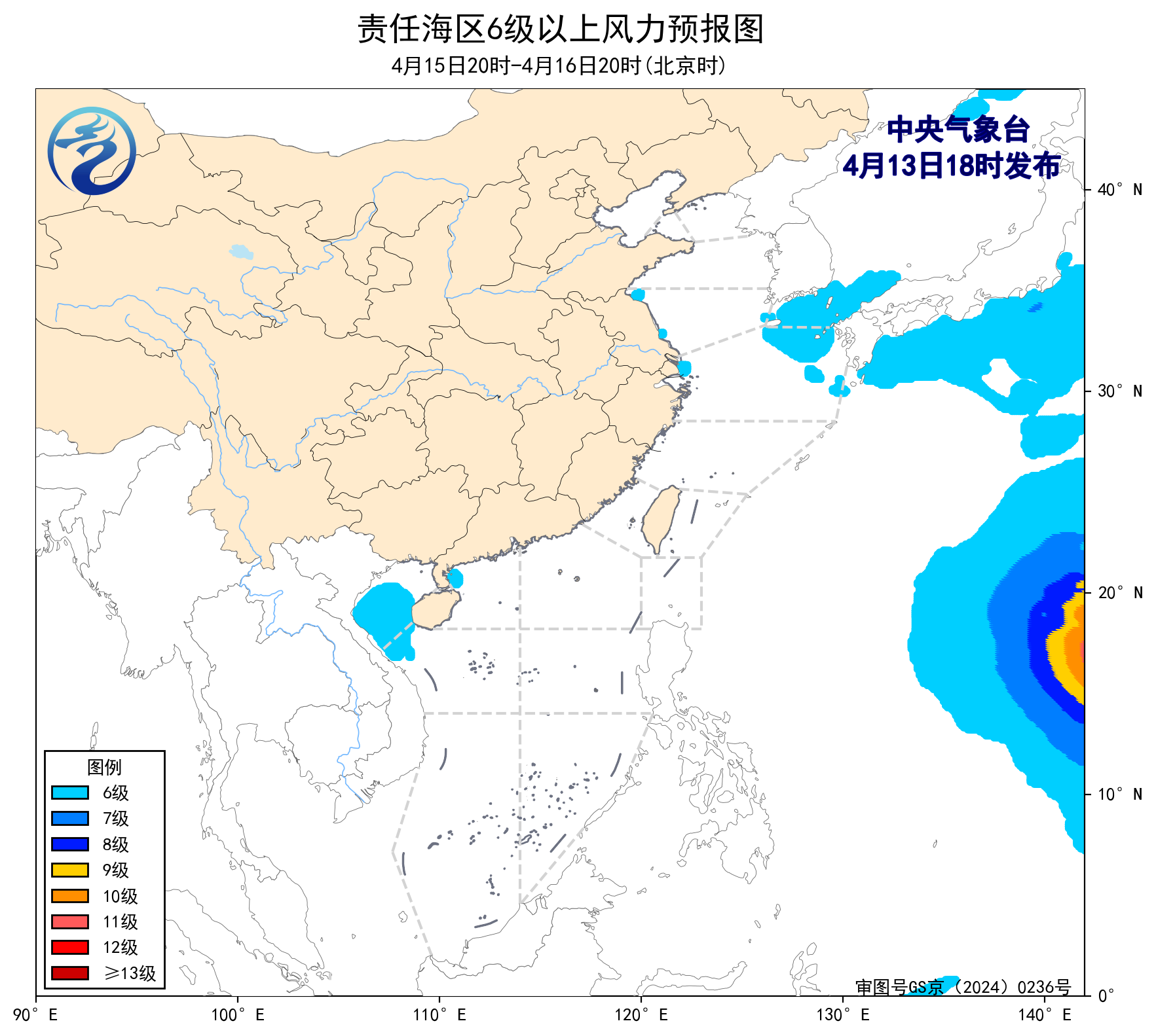 預計,4月16日夜間至20日白天,渤海、渤海海峽、黃海南部海域、東海北部海域、台灣海峽、北部灣、南海西北部和中西部海域將有5~6級、陣風7級的風。