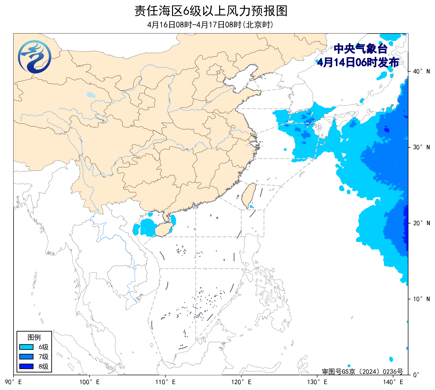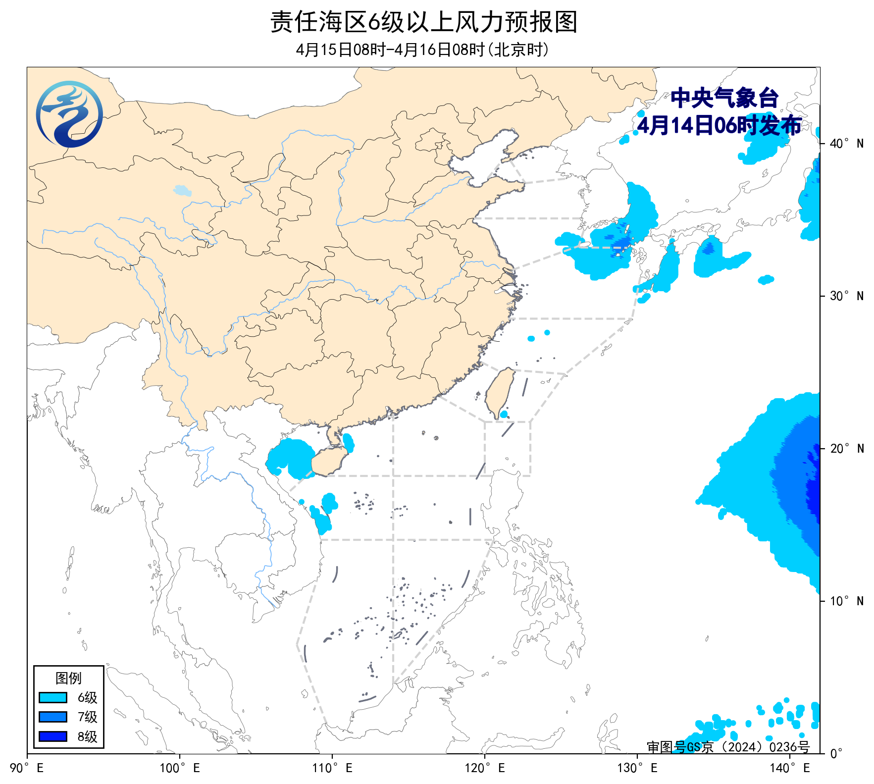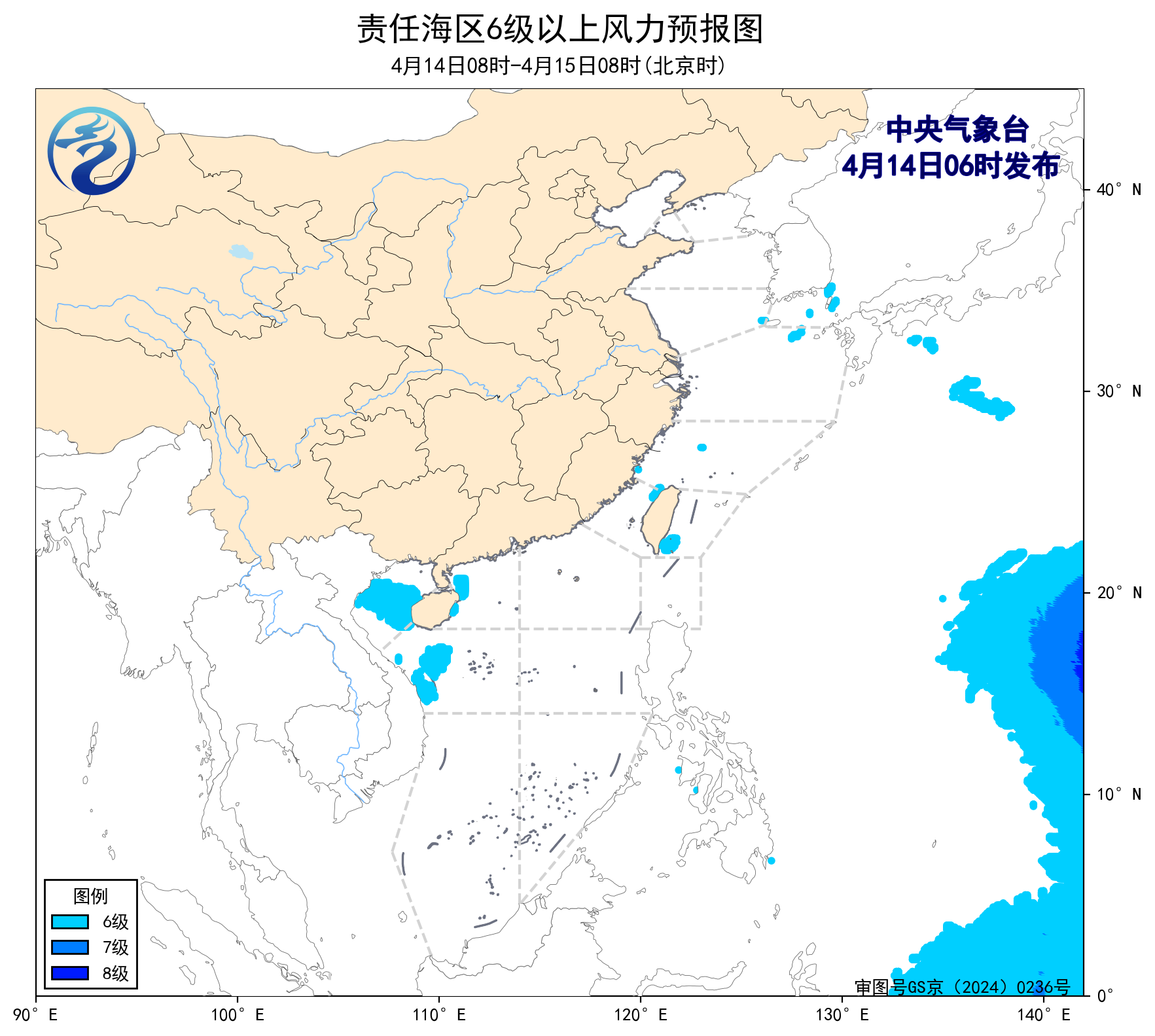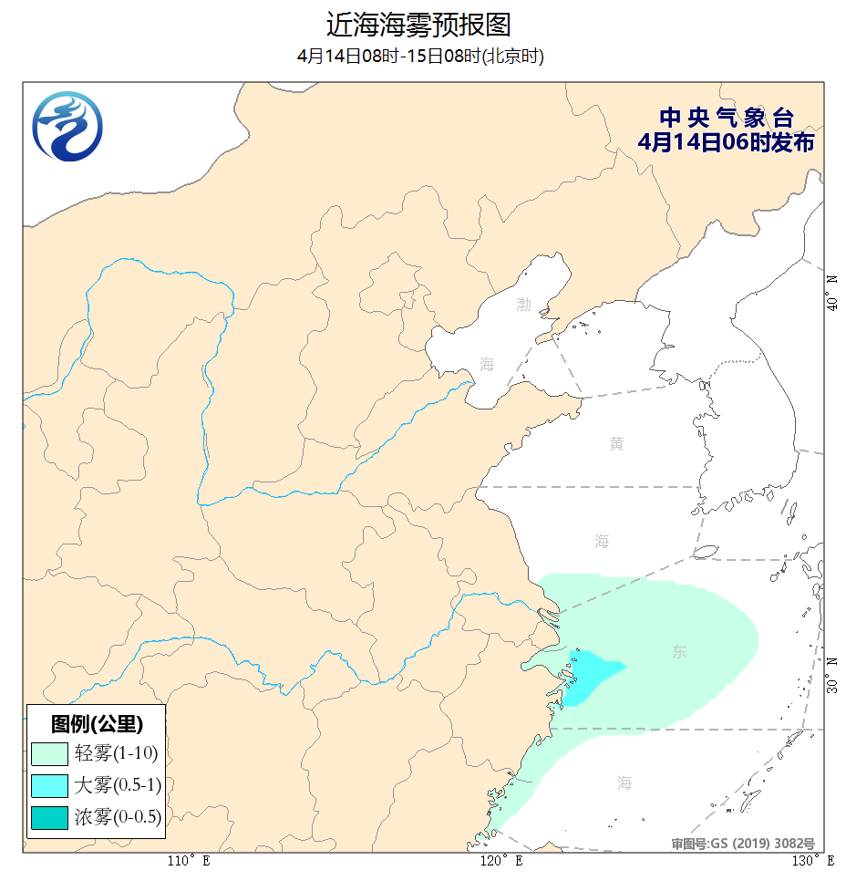 14日08時至15日08時,東海北部海域、長江口及杭州灣附近海域、浙江沿海和福建北部沿海將有能見度不足10公里的輕霧,北部灣將有5~6級、陣風7級的偏南風。