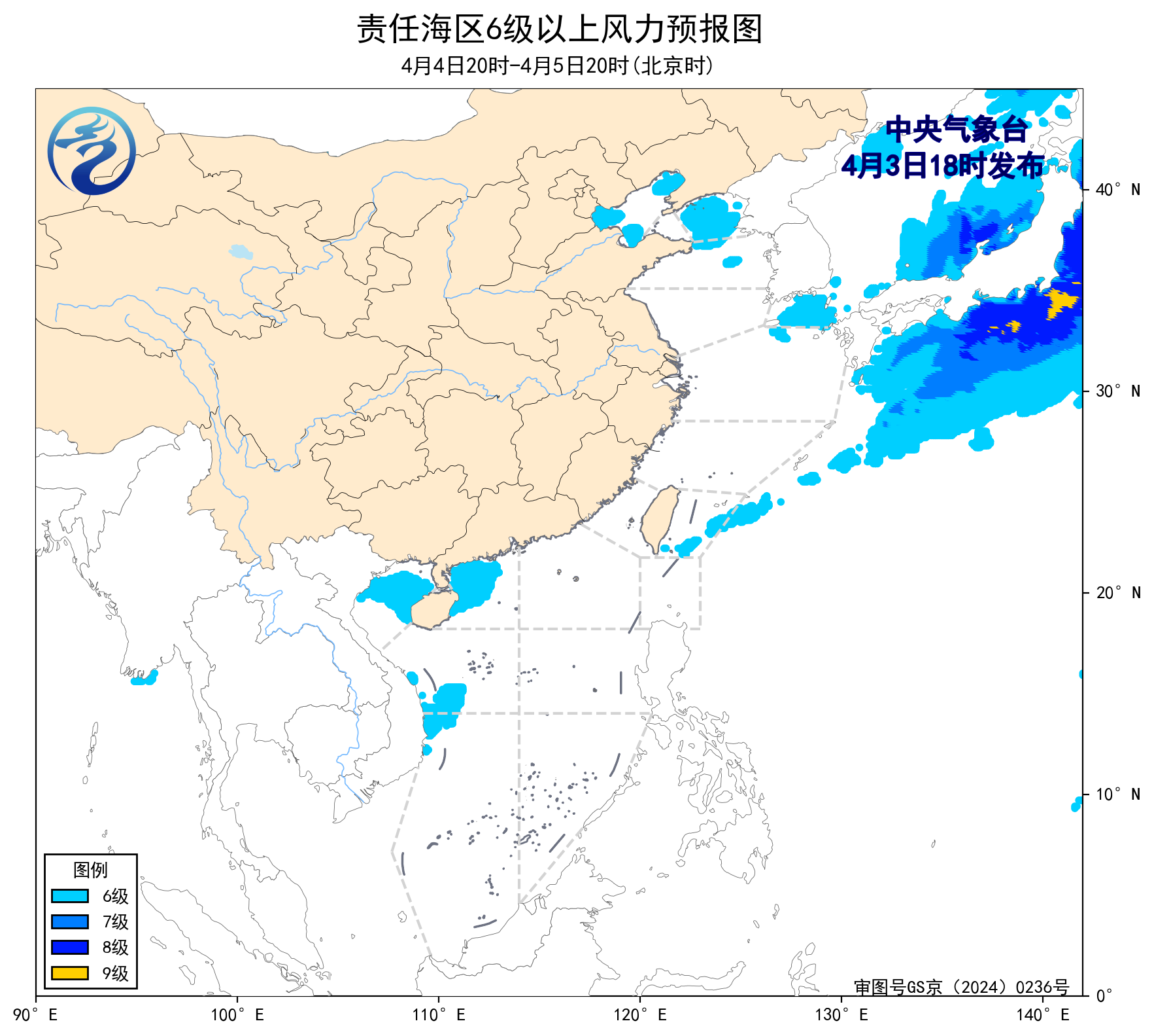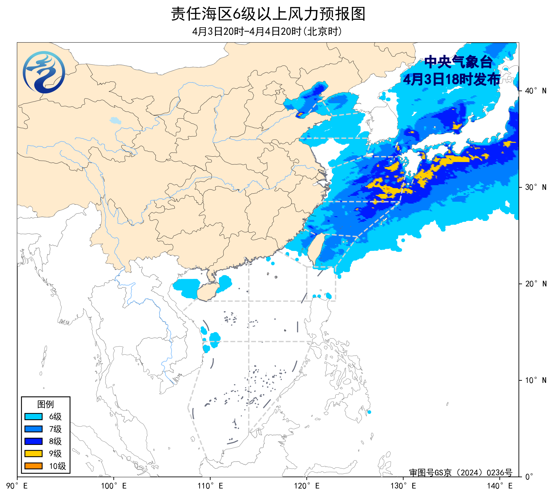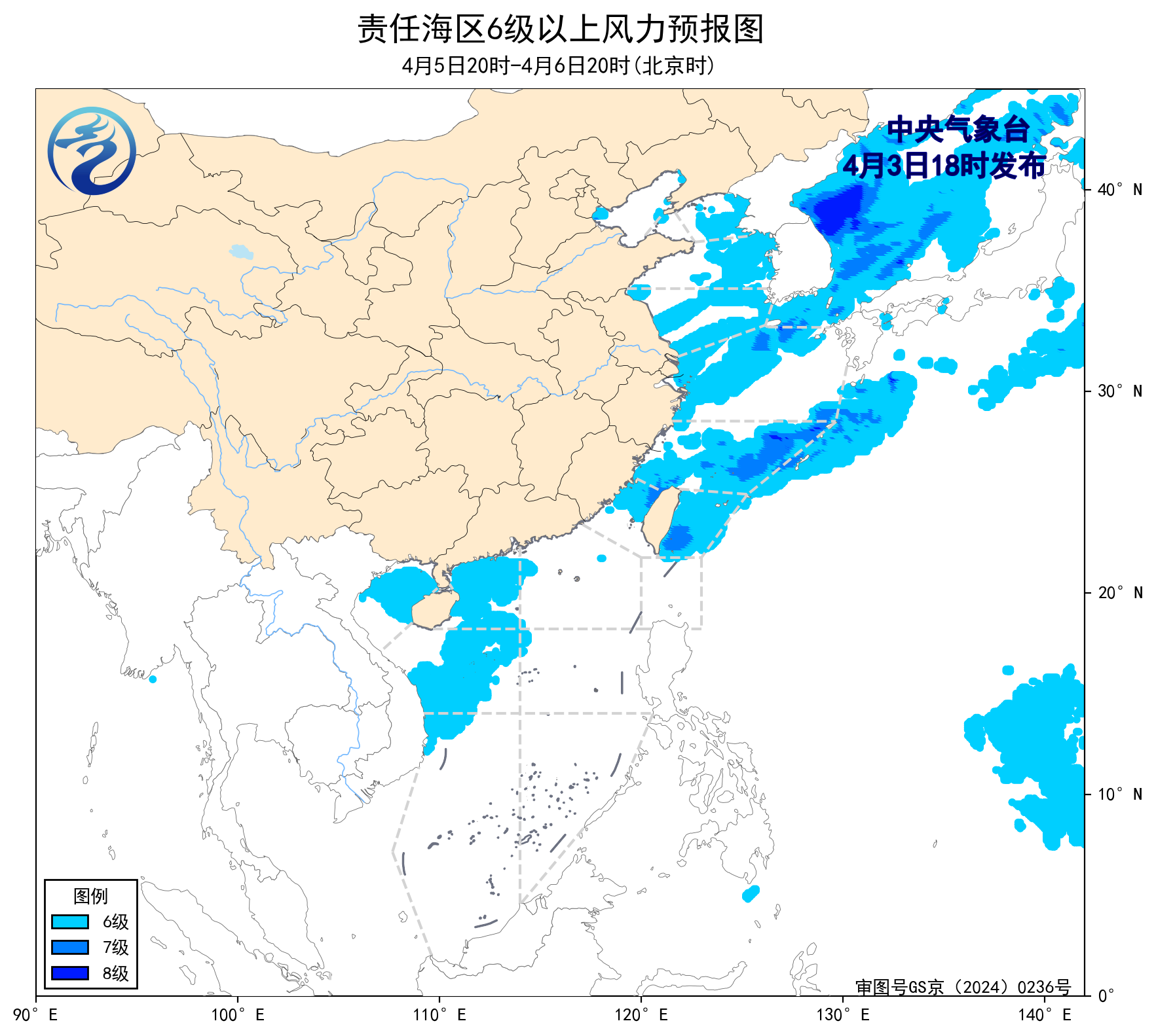 預計,4月6日夜間至10日白天,渤海、台灣海峽、台灣以東洋面、巴士海峽、北部灣將有6~7級、陣風8級的風,渤海海峽、黃海大部海域、瓊州海峽、南海西北部海域、南海東北部海域、南海中西部海域、南海西南部海域將有5~6級、陣風7級的風,東海大部海域將有6~8級、陣風9級的大風。