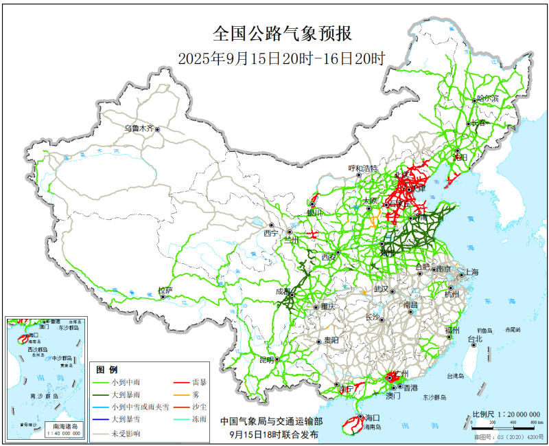中國氣象局與交通運輸部2025年9月15日聯合發佈全國主要公路氣象預報
