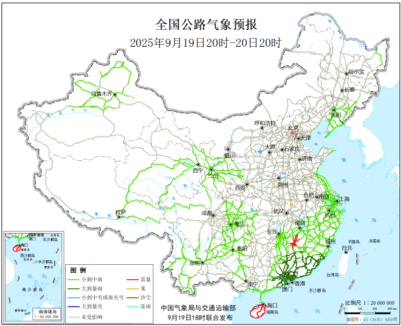 中國氣象局與交通運輸部2025年9月19日聯合發佈全國主要公路氣象預報
