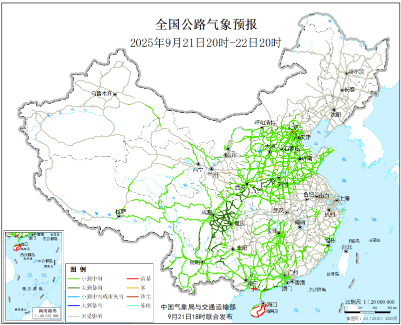 中國氣象局與交通運輸部2025年9月21日聯合發佈全國主要公路氣象預報