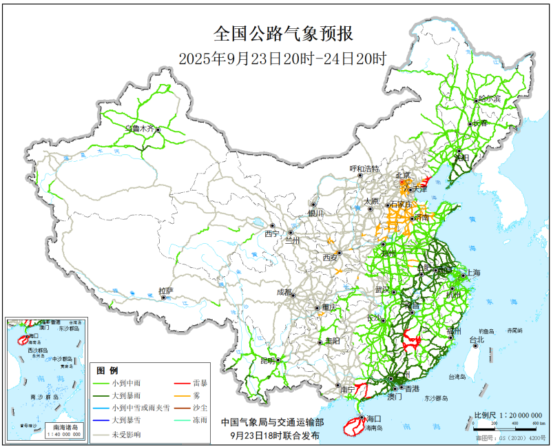 中國氣象局與交通運輸部2025年9月23日聯合發佈全國主要公路氣象預報