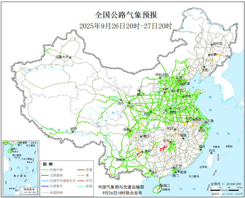中國氣象局與交通運輸部2025年9月26日聯合發佈全國主要公路氣象預報