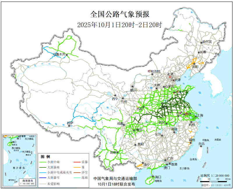 中國氣象局與交通運輸部2025年10月1日聯合發佈全國主要公路氣象預報