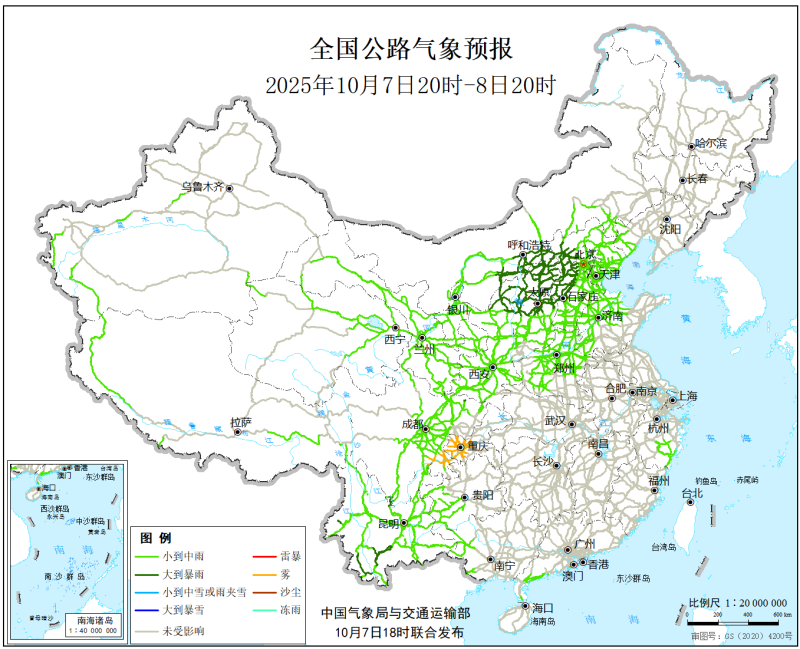 中國氣象局與交通運輸部2025年10月7日聯合發佈全國主要公路氣象預報