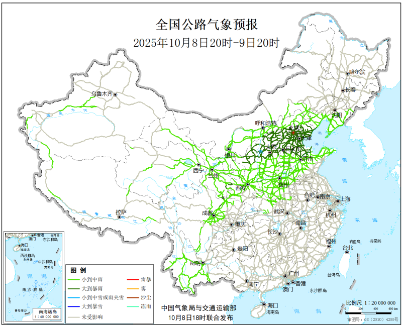中國氣象局與交通運輸部2025年10月8日聯合發佈全國主要公路氣象預報