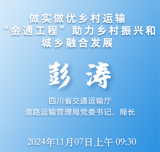 各位網友,大家好,歡迎關注本期線上訪談。鄉村運輸“金通工程”從2020年試點實施以來,已成為四川交通運輸行業鞏固拓展脫貧攻堅成果同鄉村振興有效銜接的標誌性工程,成為全國首個鄉村運輸類交通強國建設試點項目,打造了“金通小黃車”這一響亮品牌。今天,我們很榮幸邀請到四川省交通運輸廳道路運輸管理局黨委書記、局長彭濤,請他為大家介紹四川省推進鄉村運輸“金通工程”助力鄉村振興和城鄉融合發展的成果和經驗。彭局長,歡迎您!