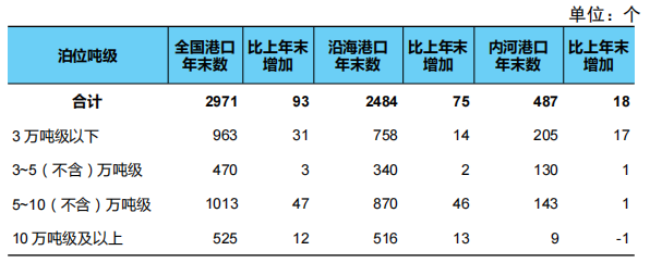 年末全國港口萬噸級及以上泊位2971個,比上年末增加93個。從分佈結構看,內河港口萬噸級及以上泊位487個、增加18個,沿海港口萬噸級及以上泊位2484個、增加75個。從用途結構看,專業化萬噸級及以上泊位1579個、增加35個,通用散貨萬噸級及以上泊位698個、增加34個,通用件雜貨萬噸級及以上泊位463個、增加16個,客貨萬噸級及以上泊位3個、與去年持平,多用途萬噸級及以上泊位193個、增加10個。