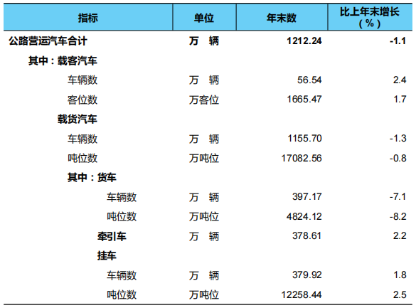 年末全國擁有公路營運汽車1212.24萬輛。分結構看,擁有載客汽車56.54萬輛、1665.47萬客位,比上年末分別增加1.30萬輛、27.18萬客位;擁有載貨汽車1155.70萬輛、17082.56萬噸位,分別減少15.27萬輛、134.15萬噸位,其中,普通貨車325.15萬輛、4037.73萬噸位,分別減少33.55萬輛、396.78萬噸位,專用貨車72.02萬輛、786.39萬噸位,分別增加3.33萬輛、減少31.35萬噸位,牽引車378.61萬輛、增加8.23萬輛,挂車379.92萬輛、增加6.72萬輛。