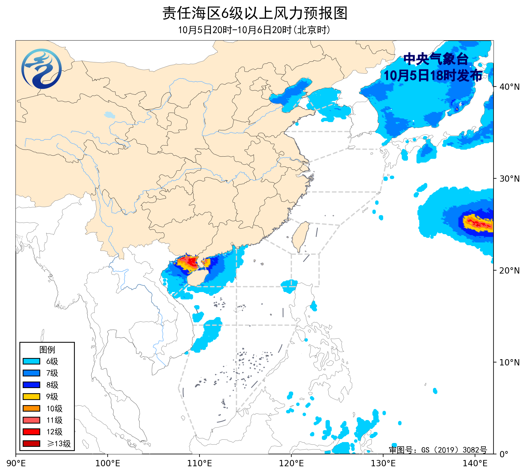 10月5日02時至14時,渤海、北部灣出現了6~8級、陣風9級的偏北風,南海東北部海域出現了6~7級、陣風8級的東南風,南海西北部海域出現了10~11級、陣風12級的偏南風,南海中西部海域出現了6~7級、陣風8級的西南風。