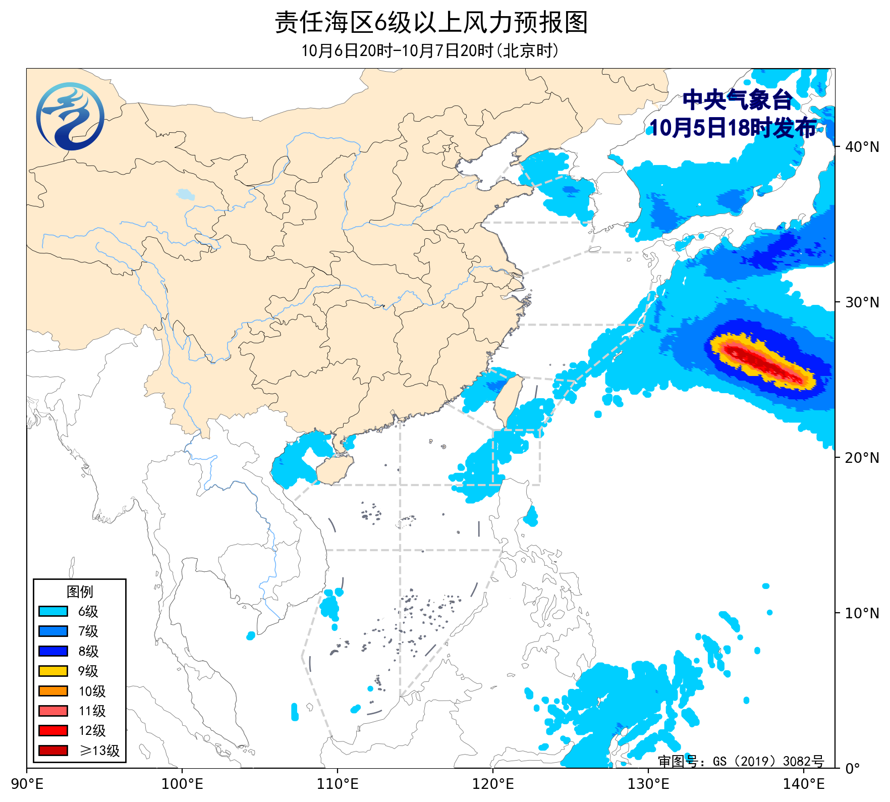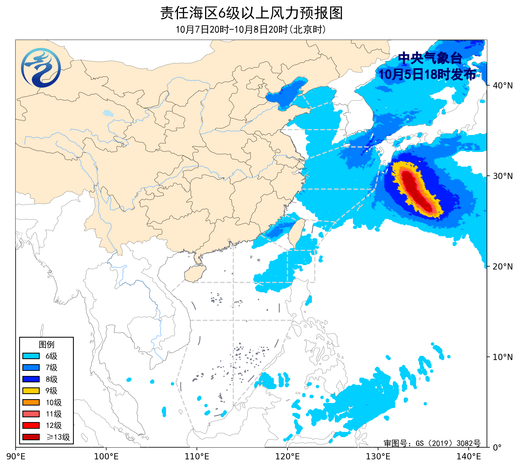 預計,10月8日夜間至12日白天,台灣海峽、台灣以東海域、東海、黃海南部和黃海中部部分海域將先後有8~10級,陣風11~12級的風,低值系統中心附近海域風力可達11~12級,陣風13~14級。