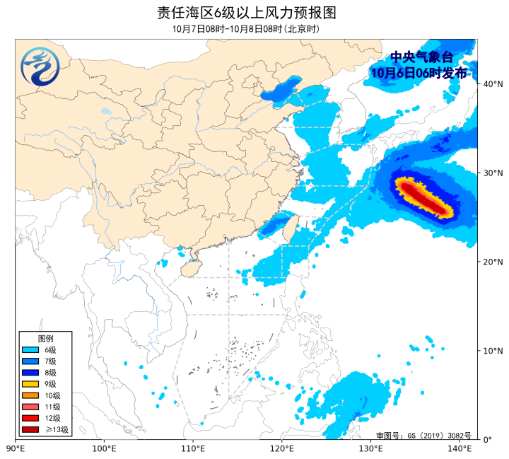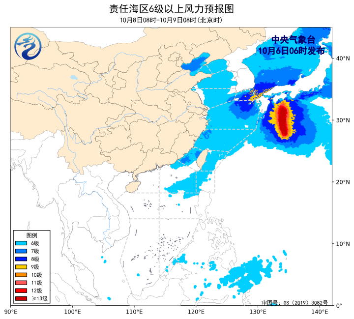 8日08時至9日08時,渤海、東海北部海域將有6~7級、陣風8級的東北風,渤海海峽、黃海北部和南部海域、東海南部海域、台灣海峽、台灣以東洋面、巴士海峽、南海東北部海域將有4~6級、陣風7級的偏北到東北風,黃海中部海域將有5~6級、陣風7級的東北風到偏東風。