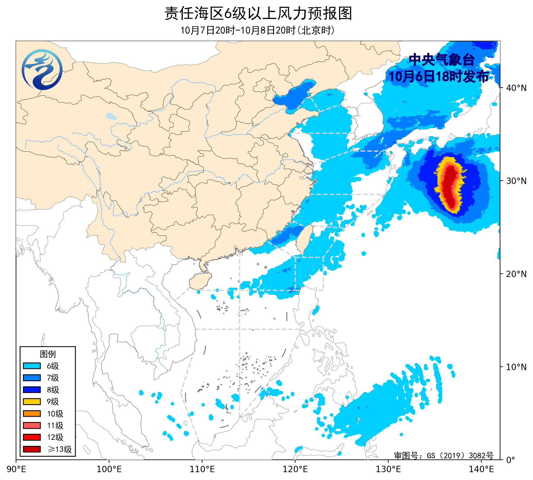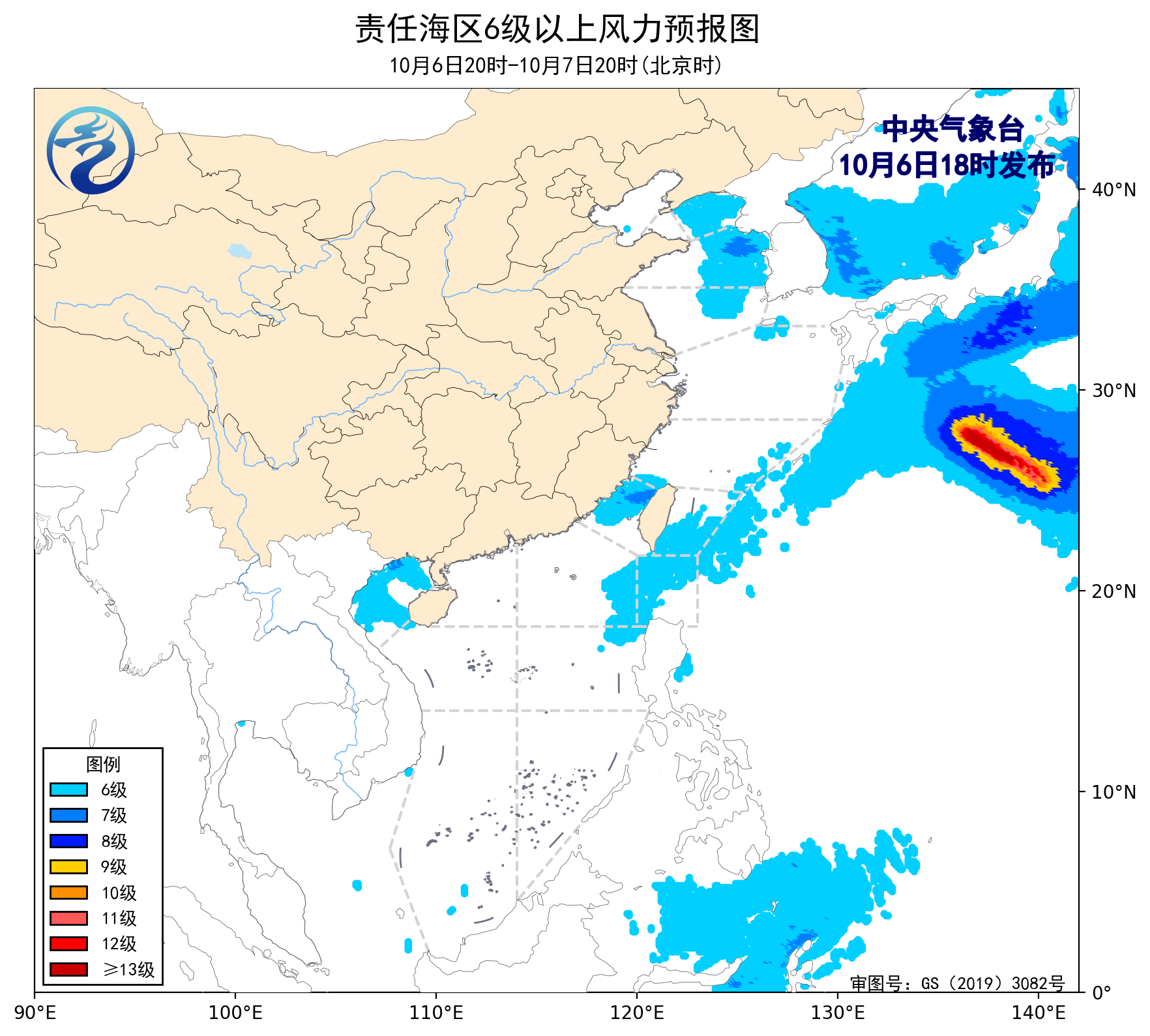 6日20時至7日20時,黃海中部海域將有5~7級、陣風8級的偏東轉偏北風,台灣海峽將有5~7級、陣風8級的東北風,黃海北部海域、東海南部海域、台灣以東洋面、巴士海峽、南海東北部海域將有4~6級、陣風7級的東北風,黃海南部海域將有4~6級、陣風7級的西北風到偏北風,北部灣將有5~6級、陣風7級的東南風。