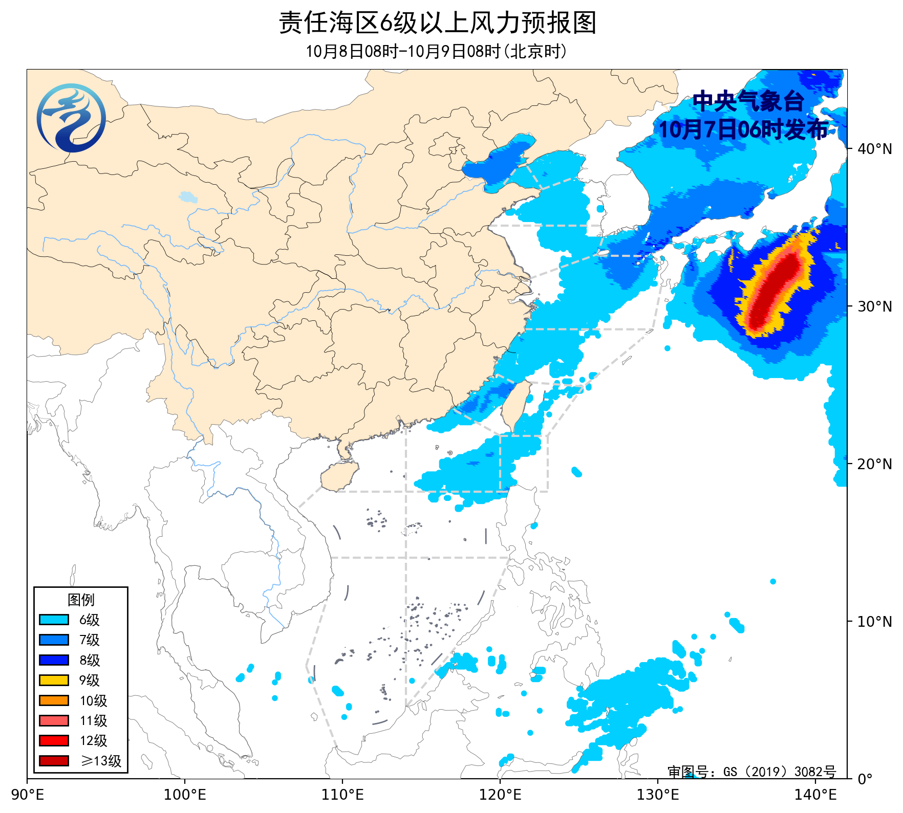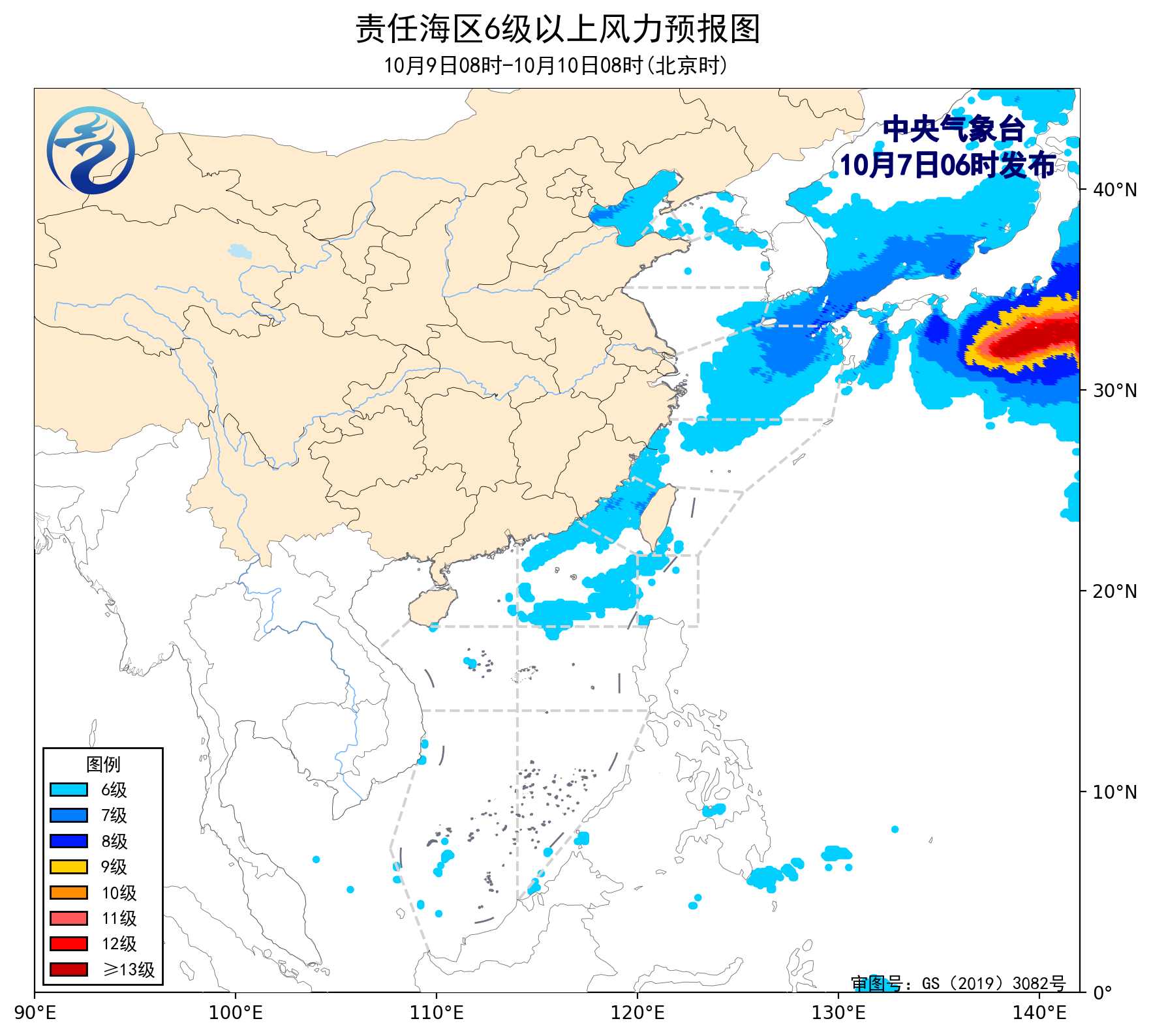 9日08時至10日08時,東海北部海域將有6~7級、陣風8級的東北風,黃海北部海域將有4~6級、陣風7級的東北風轉東南風,渤海、黃海南部海域、東海南部海域、台灣海峽、南海東北部海域將有4~6級、陣風7級的偏東到東北風。