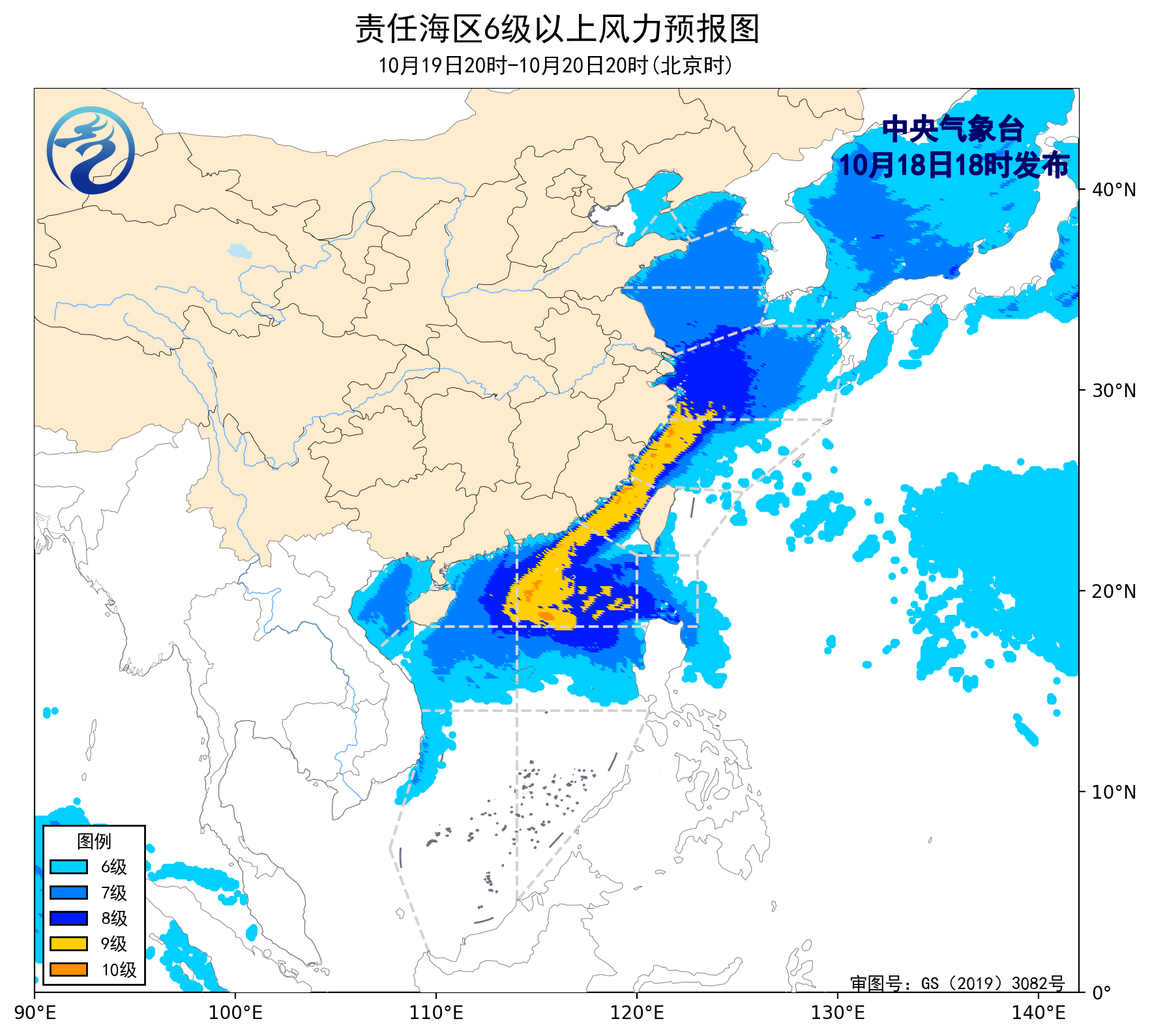 19日20時至20日20時,東海南部海域、台灣海峽、南海東北部海域將有7~9級、陣風10級的東北風,東海北部海域、南海西北部海域將有6~8級、陣風9級的偏北到東北風,南海中東部海域將有6~7級、陣風8級的偏南風,黃海大部海域、北部灣、南海中西部海域將有5~7級、陣風8級的偏北到東北風,巴士海峽將有6~7級、陣風8級的偏東風,渤海、渤海海峽、瓊州海峽將有4~6級、陣風7級的偏北到東北風,台灣以東洋面將有4~6級、陣風7級的東北風到偏東風。