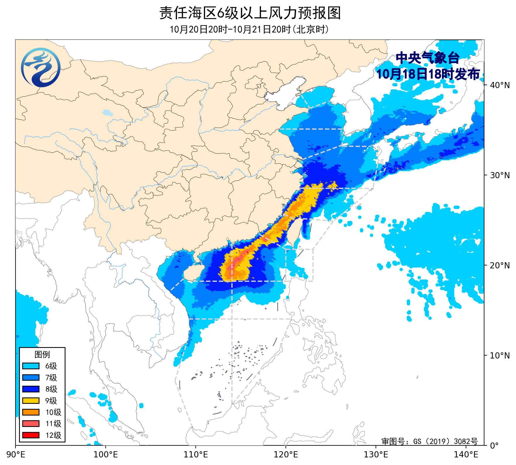 20日20時至21日20時,台灣海峽、南海東北部海域將有8~10級、陣風11級的東北風,東海南部海域、南海西北部海域將有8~9級、陣風10級的偏北風,東海北部海域將有7~8級、陣風9級的東北風,南海中東部海域將有5~7級、陣風8級的偏南風,黃海中部和南部海域、北部灣、南海中西部海域將有6~7級、陣風8級的偏北到東北風,巴士海峽將有4~6級、陣風7級的偏東到東南風,渤海海峽、黃海北部海域、台灣以東洋面、瓊州海峽將有4~6級、陣風7級的偏北到東北風。