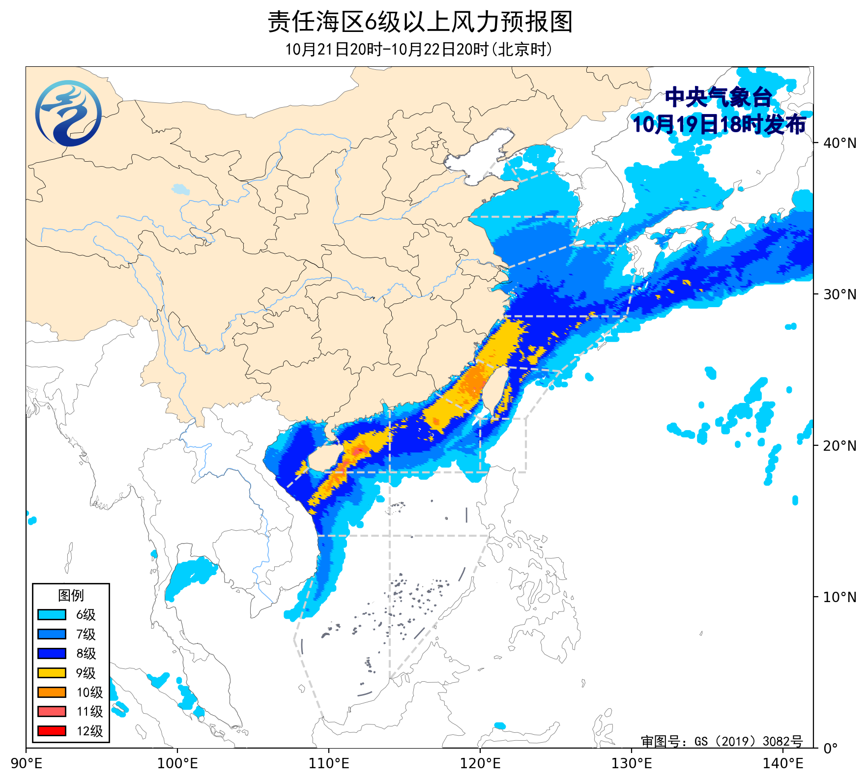 19日20時至20日20時,南海西北部海域將有6~7級、陣風8級增大到8~9級、陣風10級的東北風,東海南部海域、台灣海峽將有8~9級、陣風10級的偏北到東北風,東海北部海域、南海東北部海域將有7~8級、陣風9級的東北風,南海中東部海域將有6~7級、陣風8級的偏南風,黃海大部海域、北部灣、瓊州海峽、南海中西部海域將有5~7級、陣風8級的偏北到東北風,巴士海峽將有5~7級、陣風8級的偏東風,渤海、渤海海峽、南海西南部海域將有4~6級、陣風7級的偏北風。