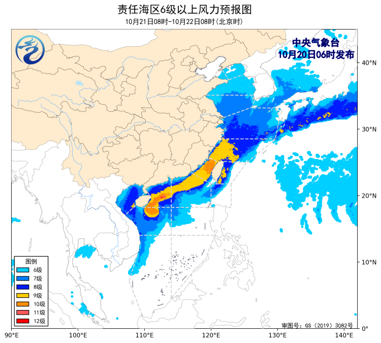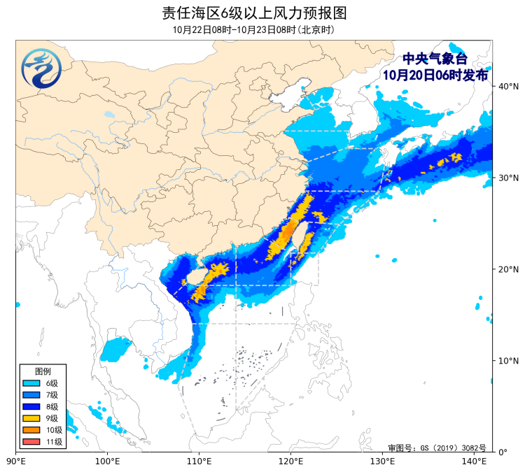 20日08時至21日08時,台灣海峽、南海西北部海域將有8~10級、陣風11級的偏北到東北風,東海南部海域、南海中西部海域將有8~9級、陣風10級的東北風到偏北風,南海東北部海域將有8~9級、陣風10級的東北風轉東南風,南海中東部海域將有8~9級、陣風10級的偏南風,東海北部海域將有7~8級、陣風9級的偏北到東北風,台灣以東洋面將有5~6級、陣風7級的東北風增大到7~8級、陣風9級的偏北風,巴士海峽將有5~7級、陣風8級的偏東到東北風,黃海大部海域、北部灣、瓊州海峽將有6~7級、陣風8級的偏北到東北風,渤海海峽、南海西南部海域將有5~6級、陣風7級的偏北風。