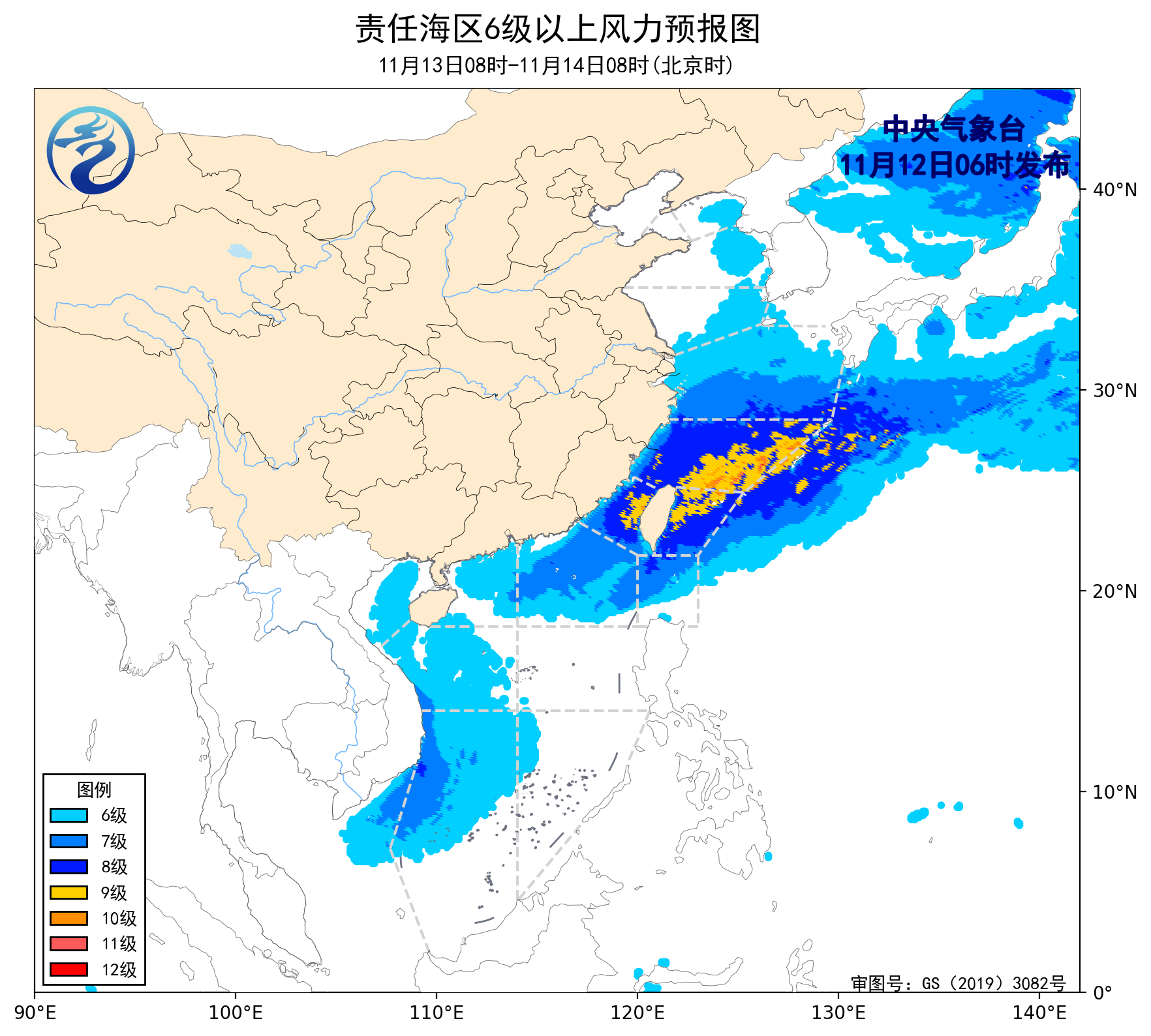 12日08時至13日08時,台灣海峽將有8~10級、陣風11級的偏北風,東海南部海域將有7~9級、陣風10級的東北風到偏北風,南海東北部海域將有8~9級、陣風10級減弱到6~7級、陣風8級的偏北風,東海北部海域將有6~8級、陣風9級的東北風,台灣以東洋面將有5~6級、陣風7級增大到7~8級、陣風9級的偏南風,巴士海峽將有7~8級、陣風9級的西南風,渤海、黃海北部海域將有4~6級、陣風7級的西南風轉偏北風,渤海海峽將有4~6級、陣風7級的偏西轉偏北風,北部灣、南海中西部和西南部海域將有4~6級、陣風7級的偏北到東北風。