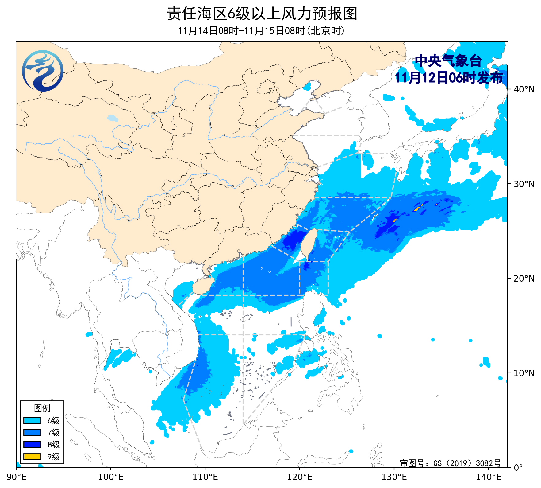 11月11日14時至12日02時,黃海南部海域、南海西北部海域、北部灣、南海中西部海域出現了5~6級、陣風7級的東北風或偏北風,東海大部海域、台灣海峽、台灣以東洋面出現了6~8級、陣風9級的東北風或偏北風,巴士海峽出現了7~8級、陣風9級的偏南風,南海東北部海域出現了8~9級、陣風10級的旋轉風。
