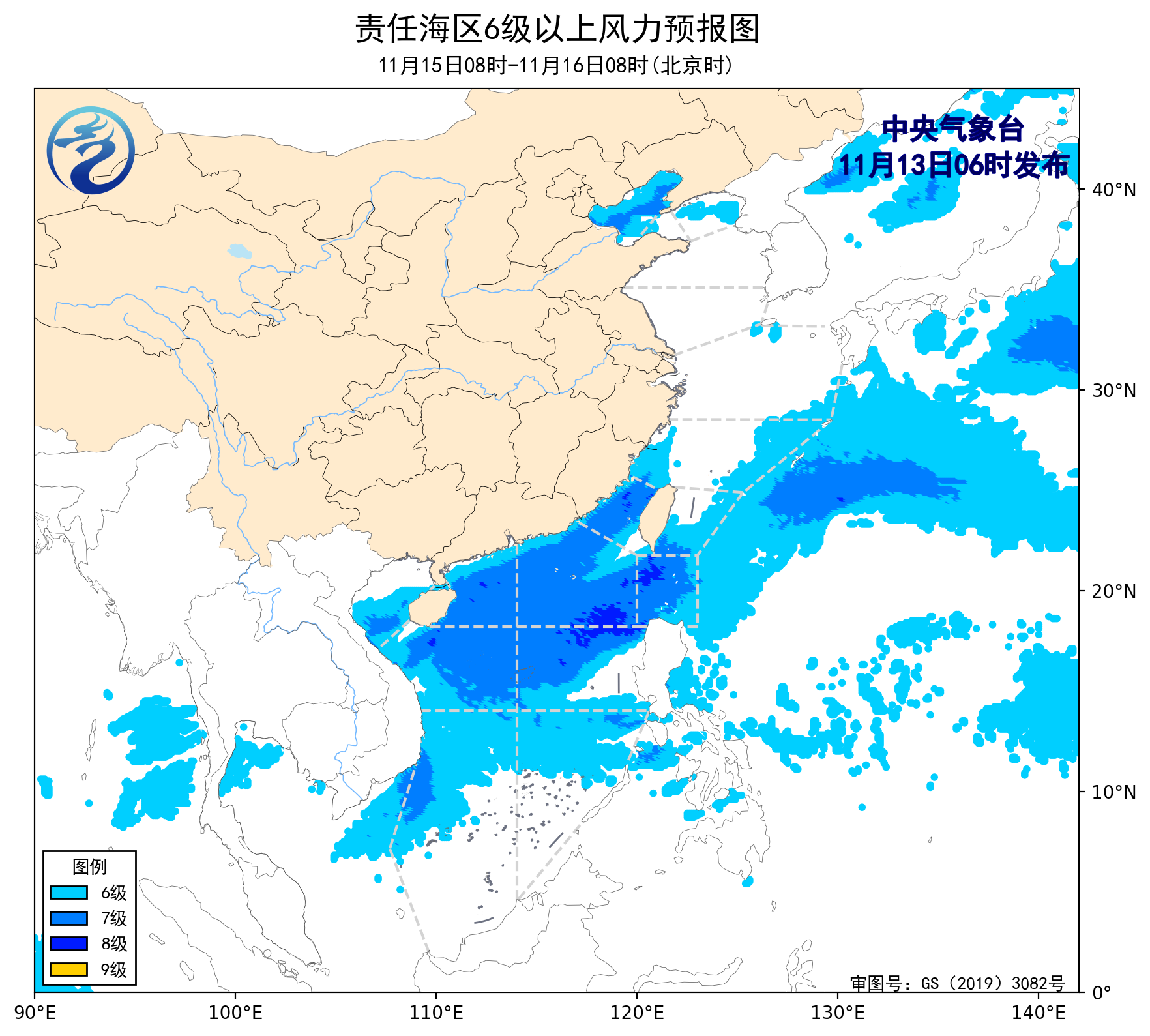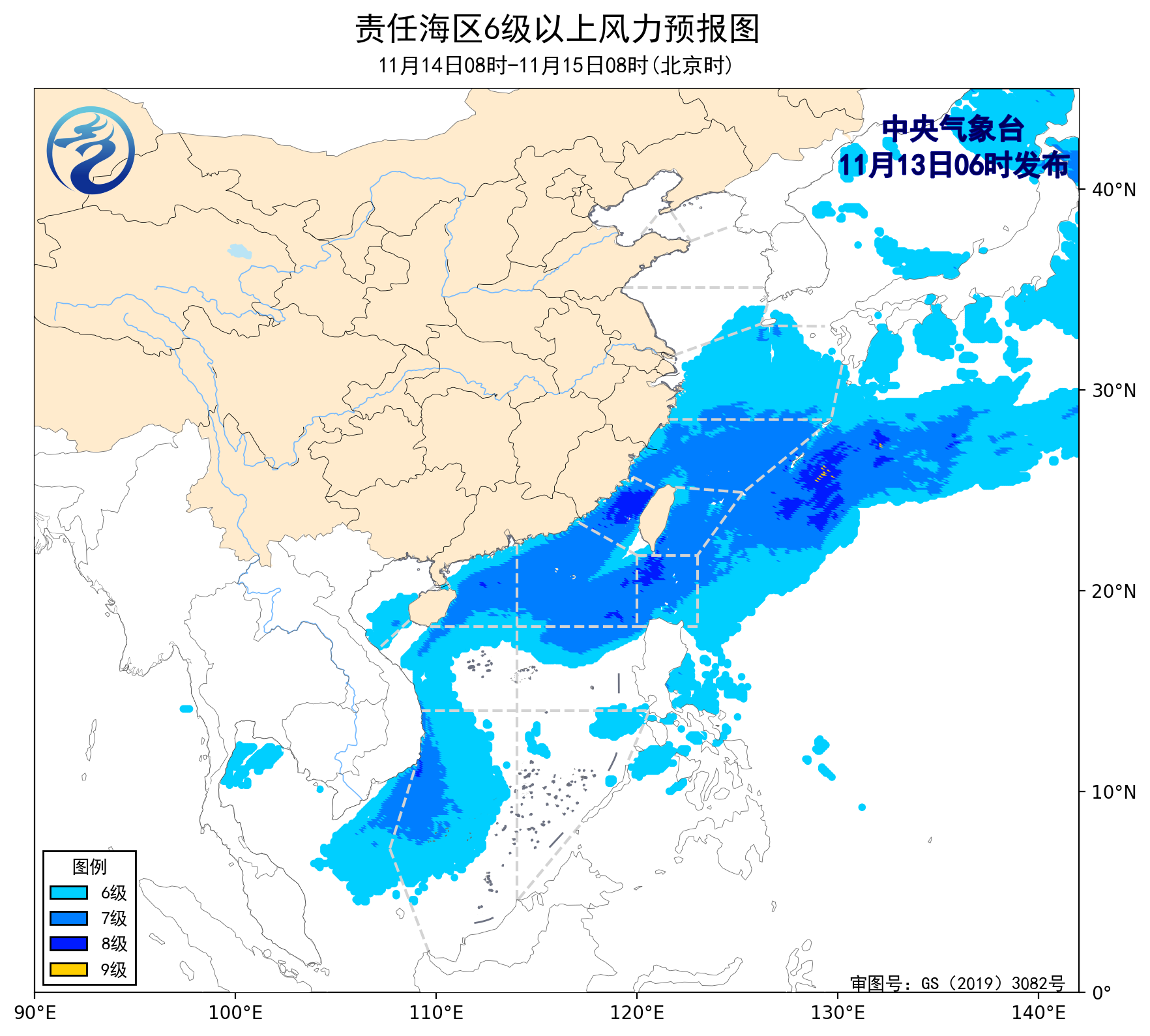 11月12日14時至13日02時,東海大部海域、台灣海峽、南海東北部海域出現了6~8級、陣風9級的東北風或偏北風,台灣以東洋面、巴士海峽出現了6~7級、陣風8級的偏南風或西南風,南海西北部海域、北部灣、南海西南部海域出現了5~6級、陣風7級的偏北風。