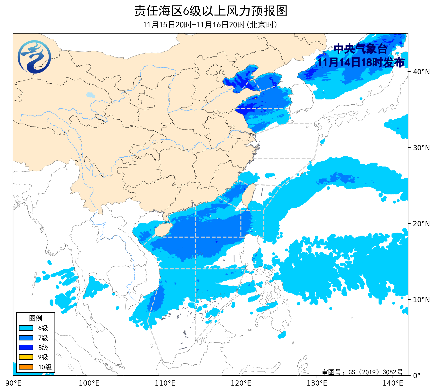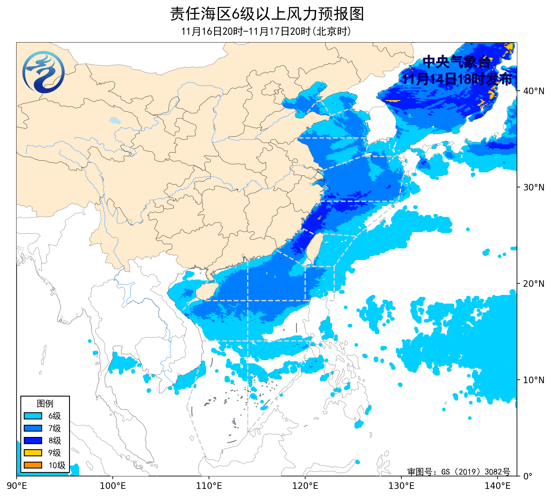 預計,17日夜間至21日白天,,渤海、渤海海峽、黃海大部海域、東海大部海域、台灣海峽、台灣以東洋面、南海大部海域、北部灣將先後有6~8級、陣風9級的大風,其中東海南部海域、台灣海峽、台灣以東洋面、南海北部海、北部灣風力可達9級、陣風10級。