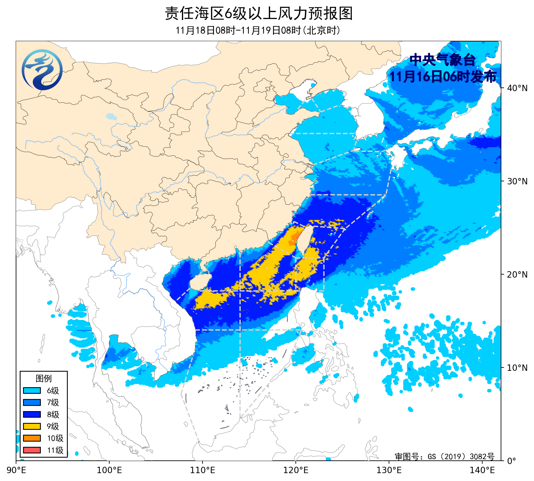 18日08時至19日08時,東海大部海域、台灣海峽、巴士海峽、南海北部和中部海域、北部灣將有7~9級、陣風10級的大風,其中台灣海峽部分海域風力可達10級、陣風11級。