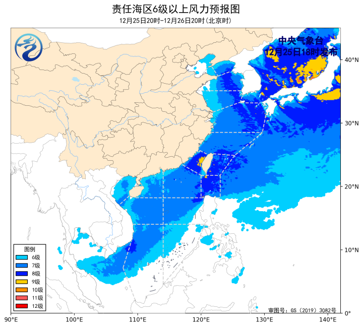 12月25日02時至14時,渤海、渤海海峽、黃海大部海域、東海大部海域出現了6~7級、陣風8級的偏北風或西北風,台灣海峽、巴士海峽、南海北部和中西部海域、南海西南部海域、北部灣出現了5~7級、陣風8級的東北風,台灣以東洋面出現了6~8級、陣風9級的東北風。