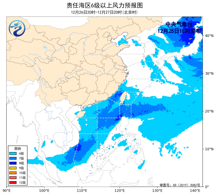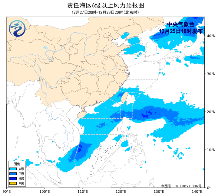 預計,2025年12月28日夜間至2026年1月1日白天,渤海、渤海海峽、黃海大部海域、東海大部海域、台灣海峽、巴士海峽、南海大部海域將有5~7級、陣風8~9級的風。